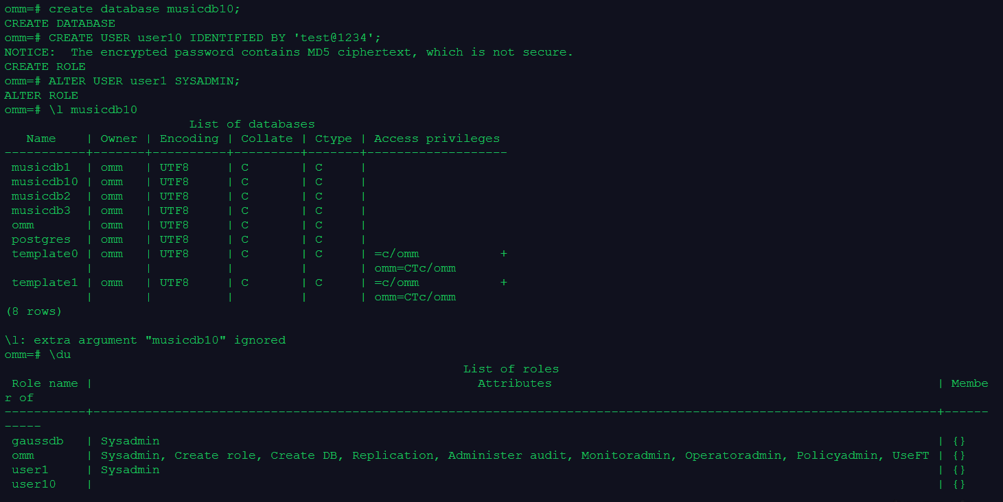 CREATE USER user10 IDENTIFIED BY 'test@1234'; --授予user1数据库系统的SYSADMIN权限: