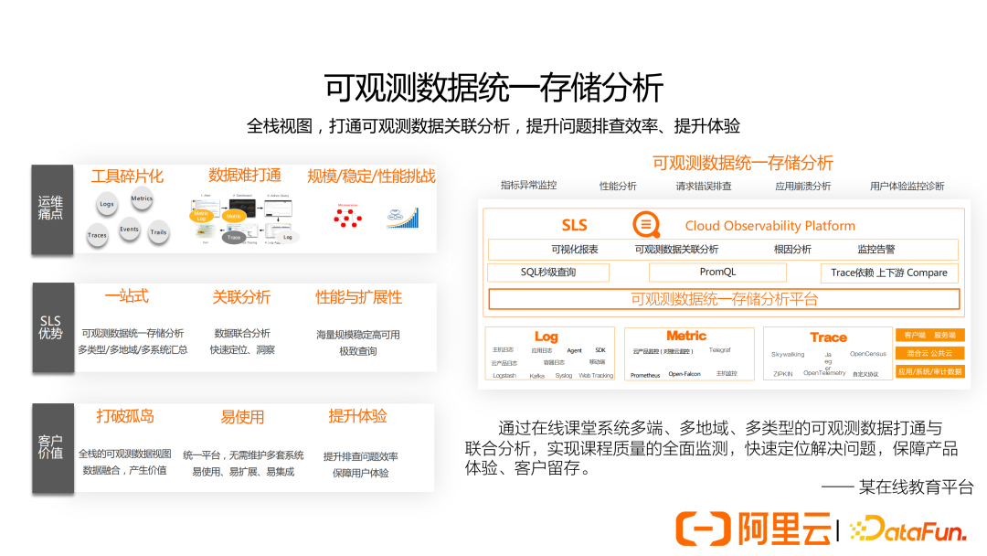 综上,SLS 支持可观测数据全面的接入,统一的存储,关联的分析,来支撑客户基于 SLS 平台构建可观测数据统一存储的分析平台,提供全栈视图来打通可观测数据的关联分析,提升问题的排查效率,从而提升客户体验。