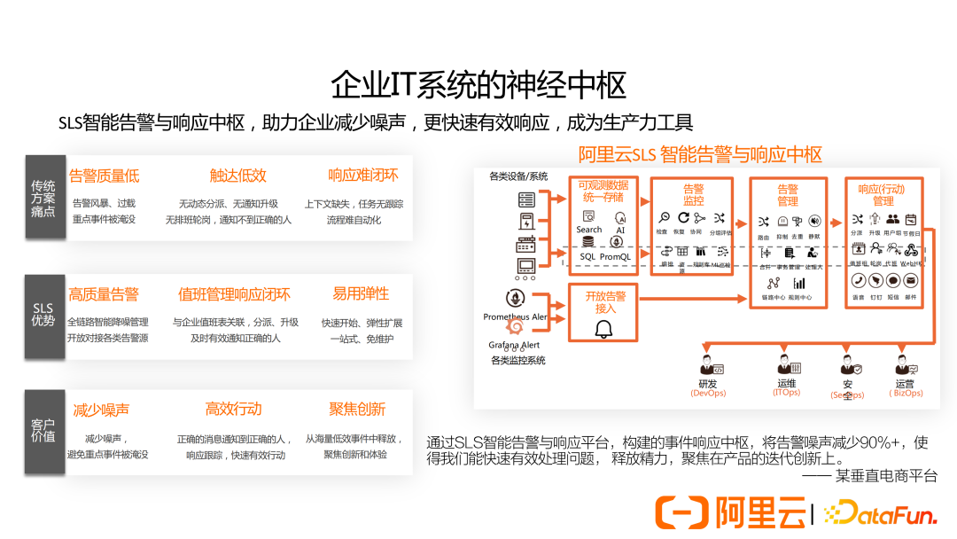 因此 SLS 的智能告警和响应中枢是一个企业 IT 系统的神经中枢,可以帮助企业去减少噪声,更快速有效的响应,成为一个生产力的工具。