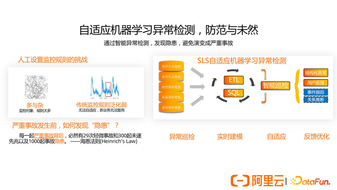 我们基于机器学习,提供 AIOps 能力,支撑客户构建智能运维系统。SLS智能巡检,对于 Metric、Log 等数据都可以进行智能巡检发现隐患,解决人工设置阈值无法覆盖的问题,例如在人工设置过程中,规则也会遇到各种挑战,监控的对象也会非常复杂,人工设置的阈值会出现过多的误报和漏报。同时,智能巡检支持反馈优化,通过客户对于巡检结果的点击与处理反馈,模型会自动适配客户的数据与场景,因此 SLS 提出的智能巡检和自适应算法,可以支持不同业务的特点和模型,来提供反馈优化的能力,系统可以根据运维开发来反复检测异常反馈来迭代优化算法,有效帮助客户防患于未然。