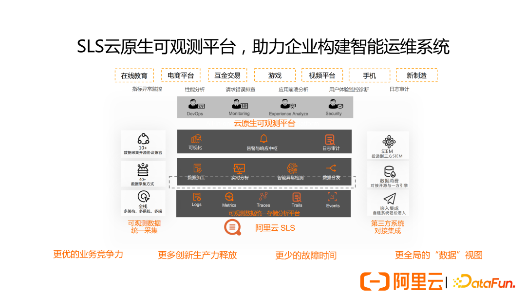提供很多 Ops 领域场景化能力,来发挥可观测数据融合优势,对于客户业务应用,包括 DevOps,Monitor以及用户体验分析和安全等,提供了场景 Insight,包括 ITOps 开发运维应用、SecOps 安全运维应用与 FinOps 成本分析应用。基于以上架构,我们将不断探索生态,去构建一些应用生态、定开交付生态,服务开源生态与伙伴等。总体来说 SLS 云原生可观测数据平台,可以帮助企业运维平台从一个成本中心转变为创新生产力的工具。