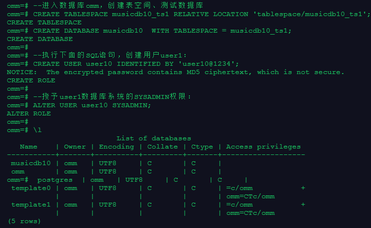 --进入数据库omm,创建表空间、测试数据库