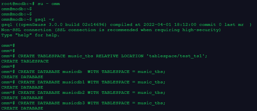 CREATE TABLESPACE music_tbs RELATIVE LOCATION ‘tablespace/test_ts1’;
