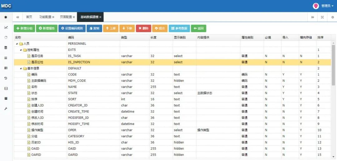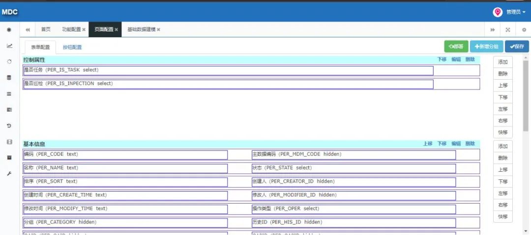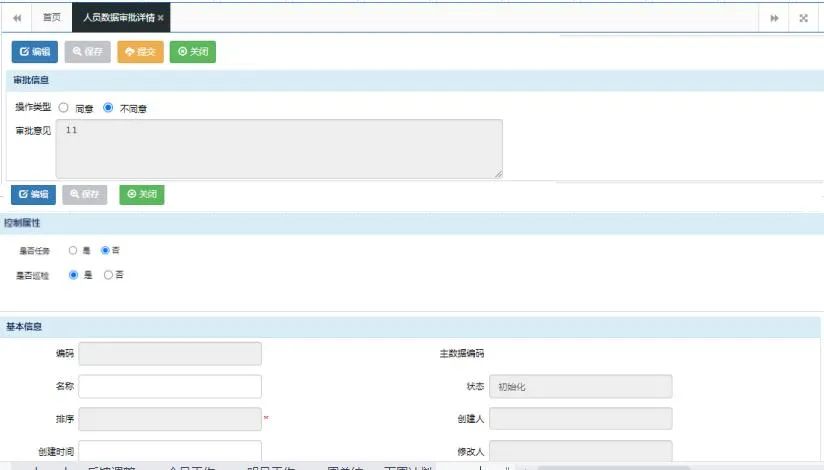 可以看到控制属性分组和基本信息属性分组。控制属性分组是进行是否生成任务和是否巡检的判定,可以在表单页面显示也可以在审批页面显示。
