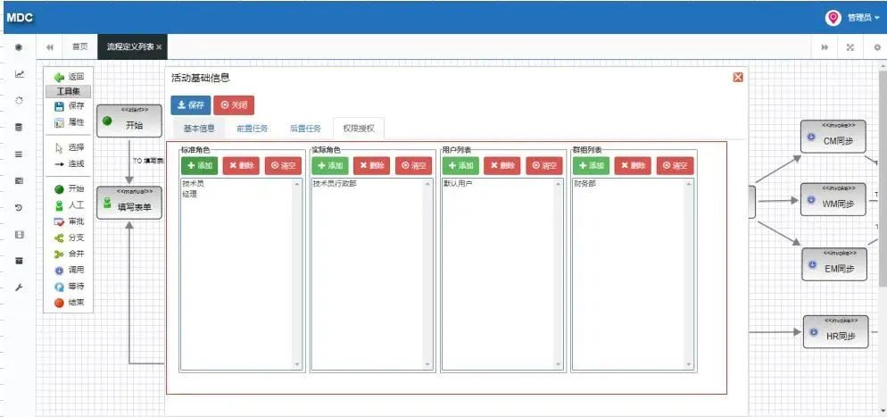 2.流程人工编辑表单页面进行权限控制,不同角色看见不同的属性和按钮。
