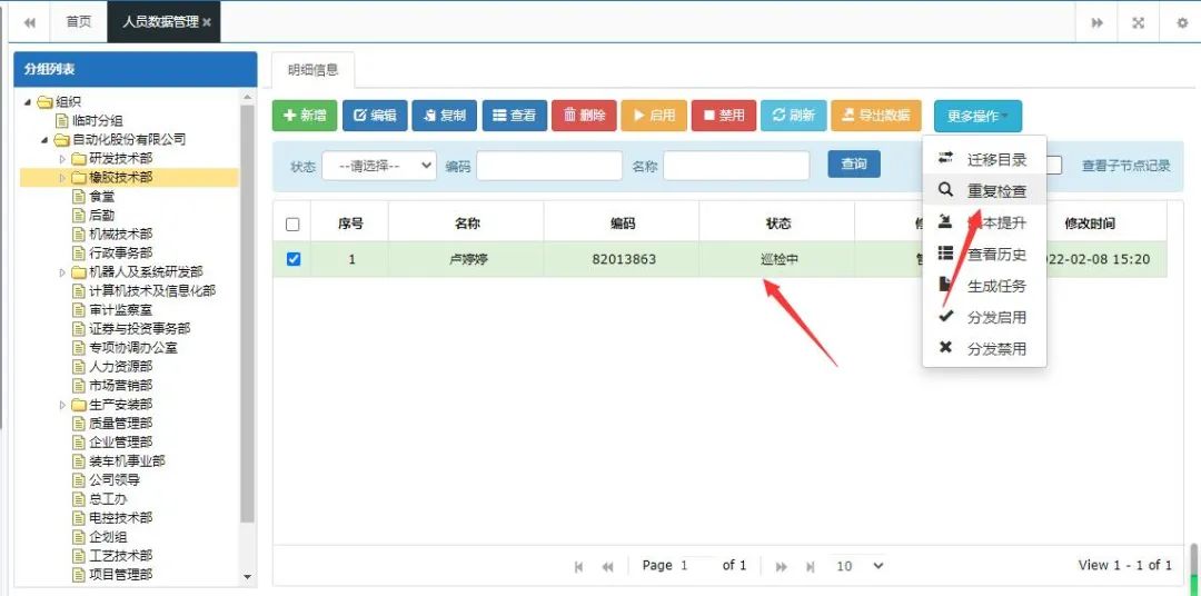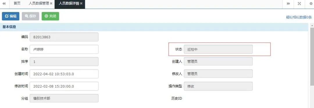 部署生成页面后,在数据管理中选择数据后点击查重检查按钮,状态变成巡检中,且只能查看,不能进行其他操作。