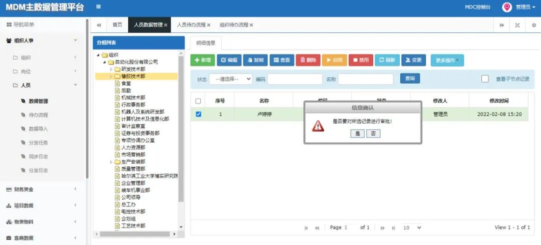 MDM支持数据审批功能,通过审批功能人工进行数据的校验,保障数据的准确性,而通过源头进入的数据有可能是多源头的数据,数据同步到MDM中需要人工进行数据补全,在接口同步时也需要支持是否生成审批流程。