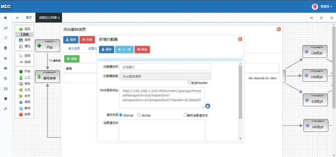 点击数据巡检是否巡检是流程变量,在后置拦截器中进行配置调用扩展的数据巡检接口。