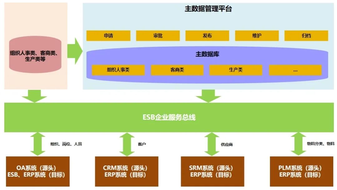 各类数据从源头系统经ESB进行映射转换后,同步至主数据管理平台,由主数据管理平台对数据进行数据治理,将数据规范化,再经ESB进行映射转换,将数据分发至目标业务系统,集成架构图如下: