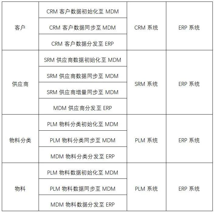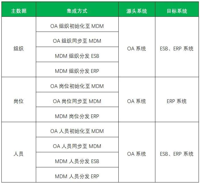 各类主数据相关的集成方式以及源头和目标系统如下: