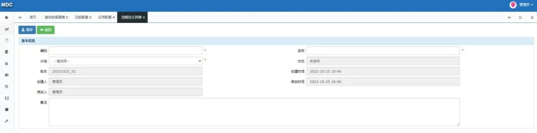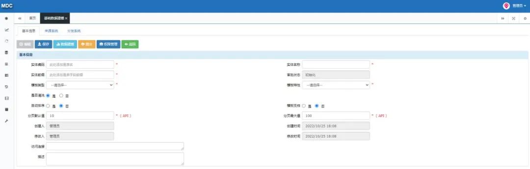 在MDC的基础数据建模中进行主数据的新增,配置基本信息,如图: