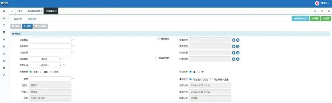 此时已经完成数据建模的配置,接下来进行功能建模,在功能配置中点击新增,并配置基本信息,如图:
