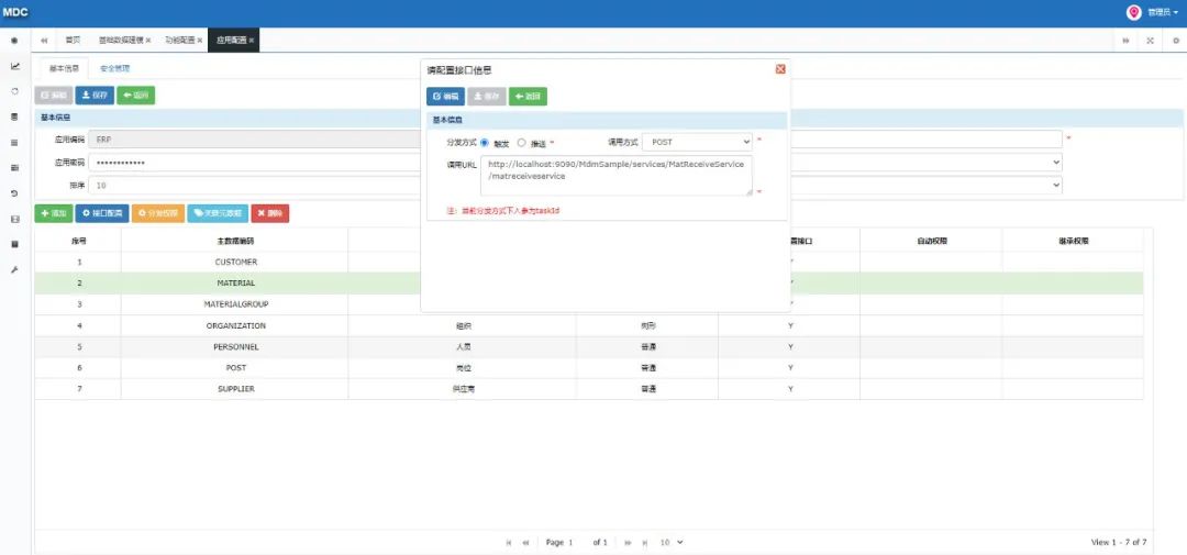 在MDC的应用配置中,打开目标系统,选择要分发的数据,点击接口配置如图: