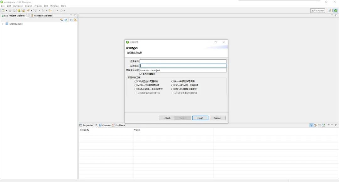 配置应用名称、应用编码以及目录,选择要创建的样例,在这里为MDM+ESB主数据集成,如图: