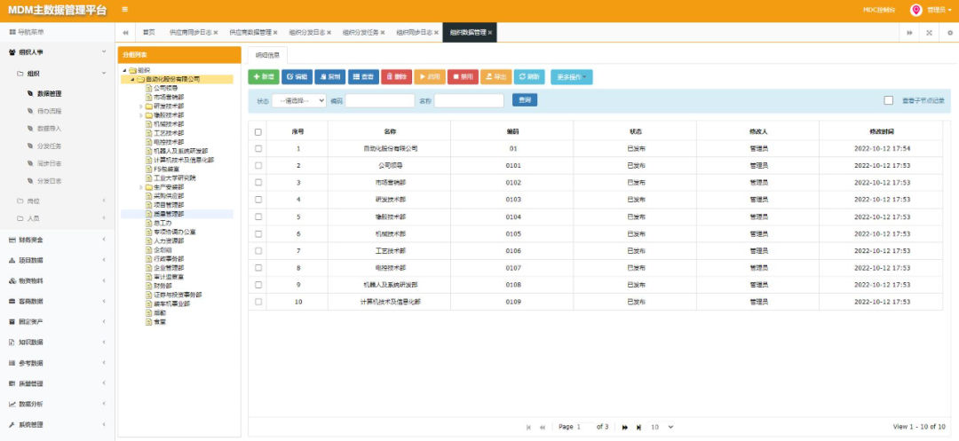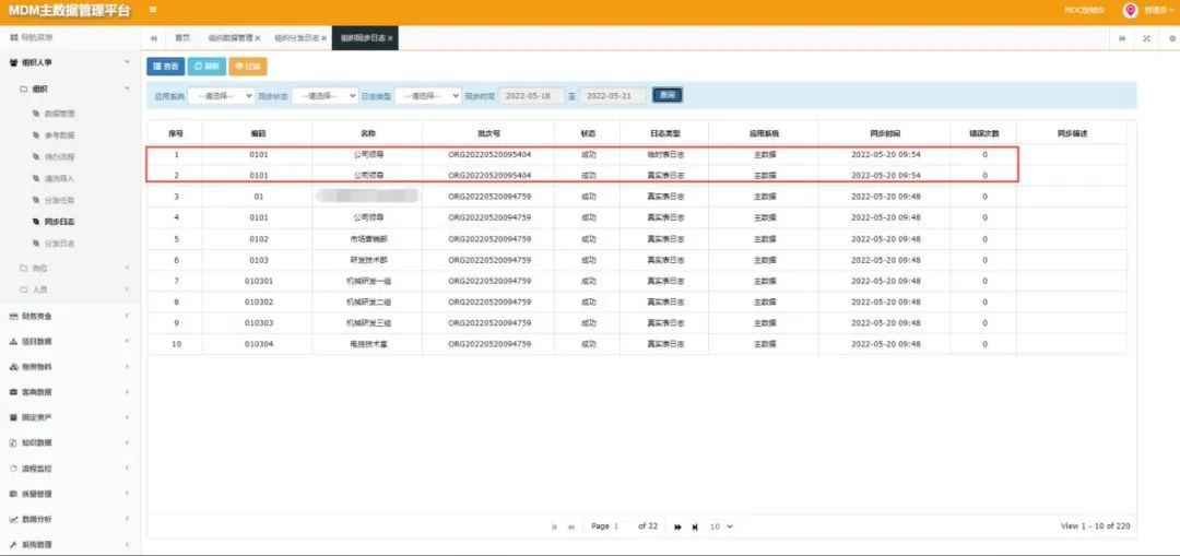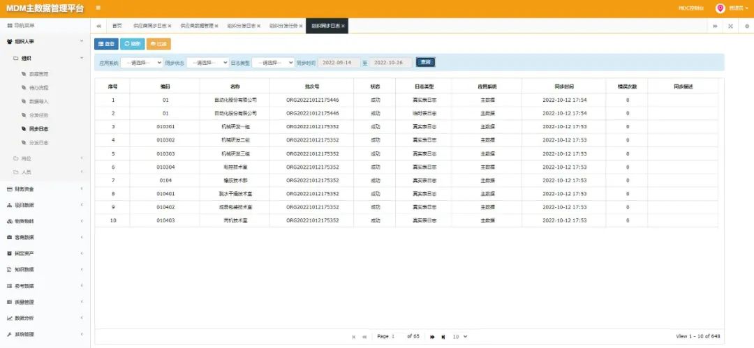 在数据管理界面查看组织是否同步至主数据管理平台,如图: