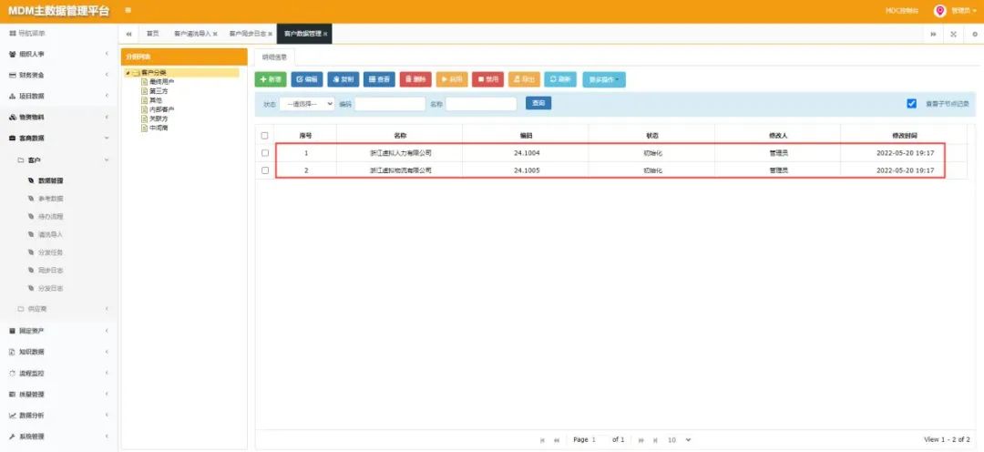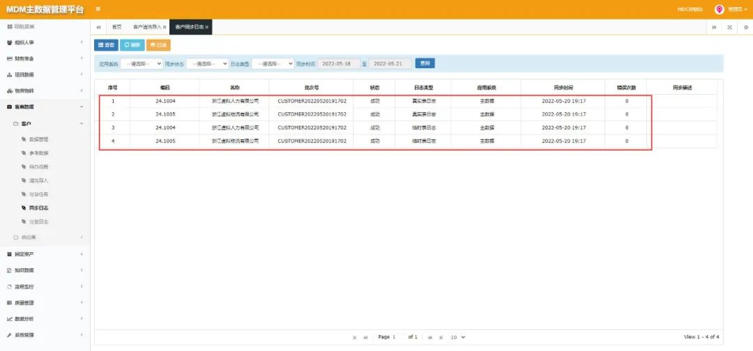 在数据管理界面查看客户是否同步至主数据平台,如图: