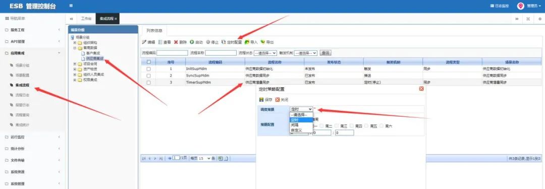 定时流程配置在供应商主数据集成之中,在集成流程中配置定时策略,默认每天早上8:00执行定时流程,配置位置如下图,配置完成后点击启动按钮流程即开始按照定时策略进行调用: