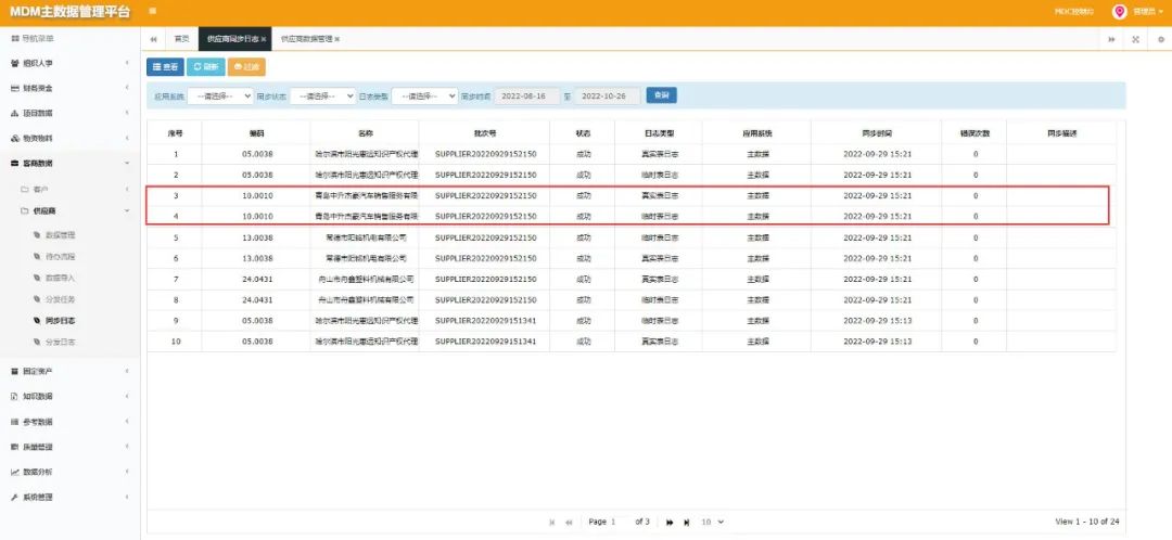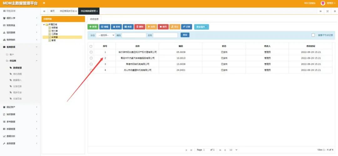 在数据管理界面查看供应商是否同步至主数据平台,如图:
