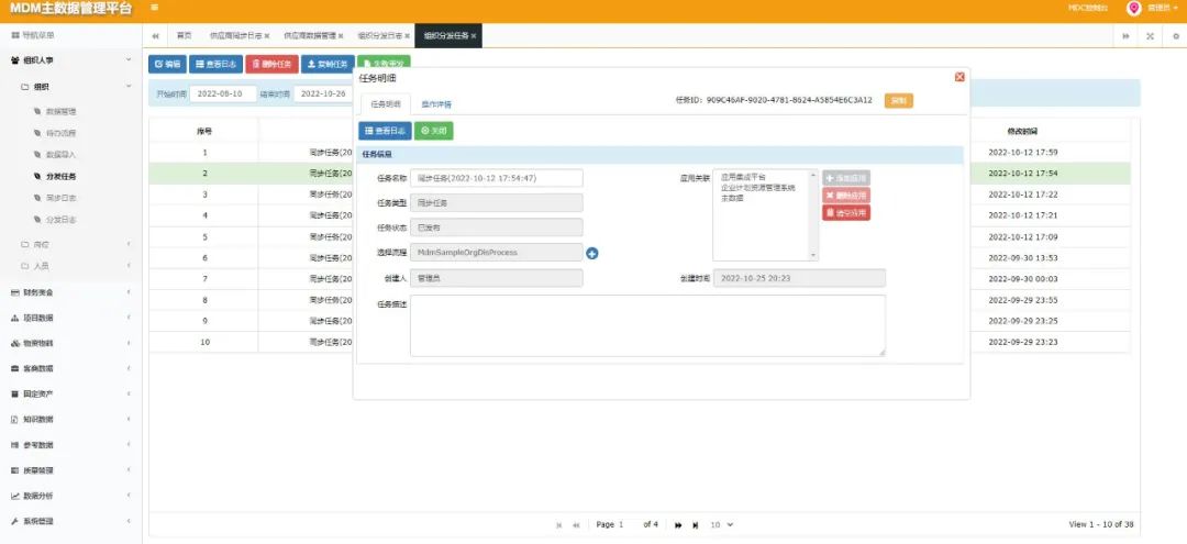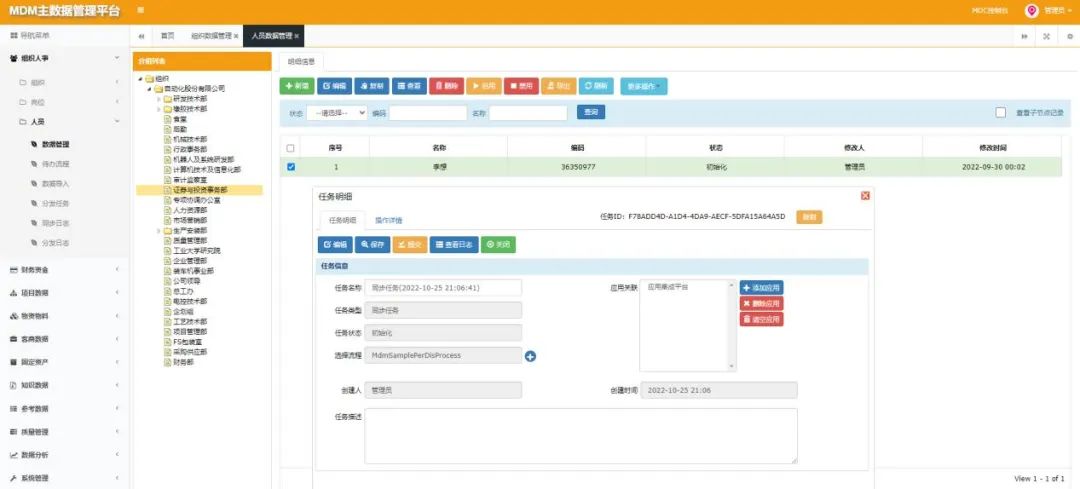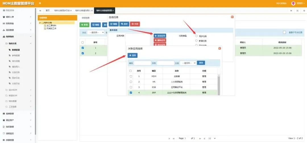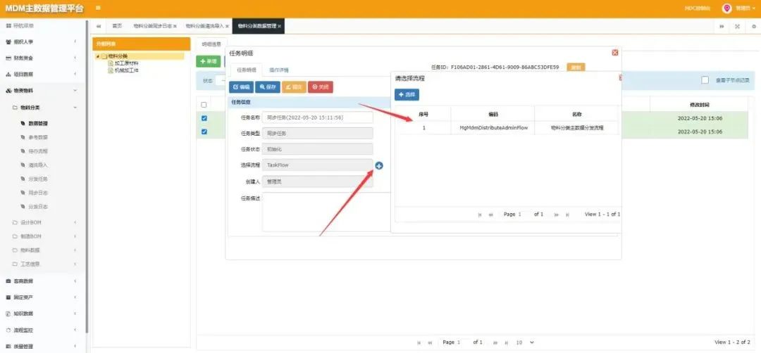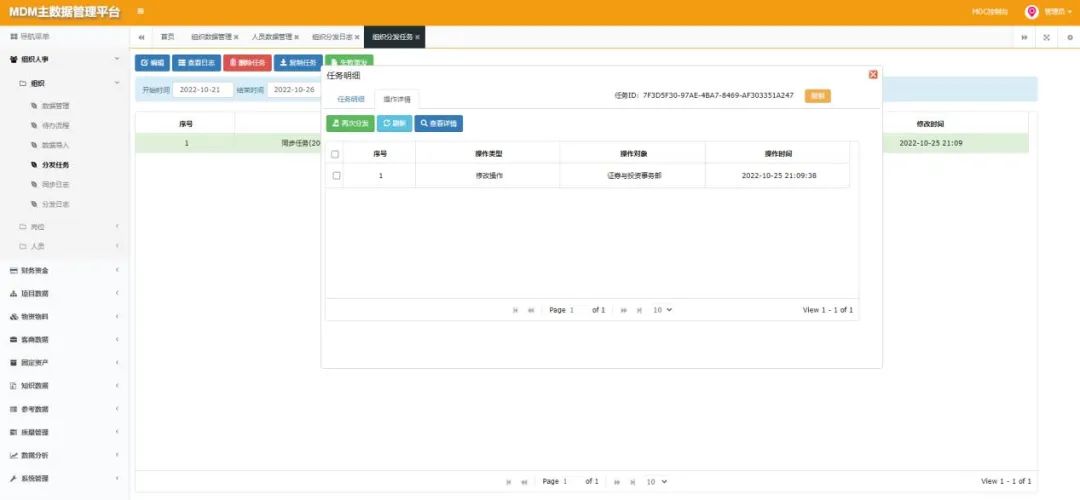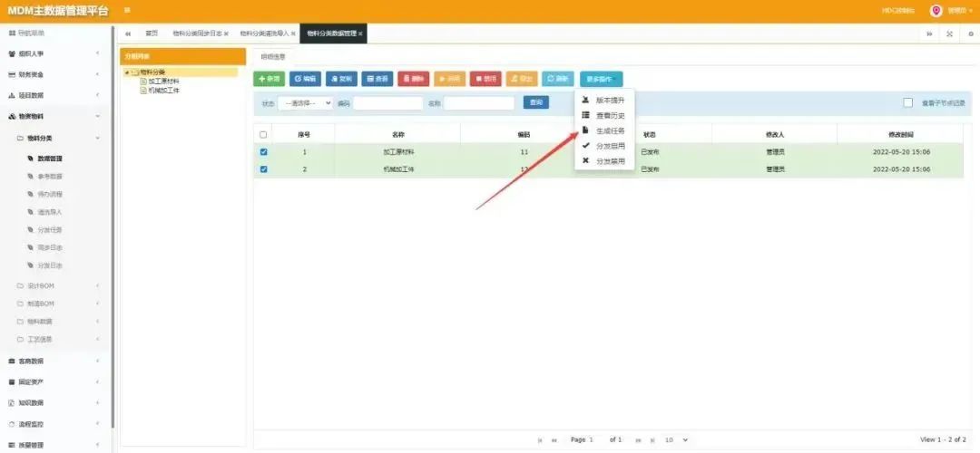 如果数据是在主数据系统进行录入,同时希望分发至下游系统,可以手动生成任务,选择目标系统进行分发操作,步骤如下:
