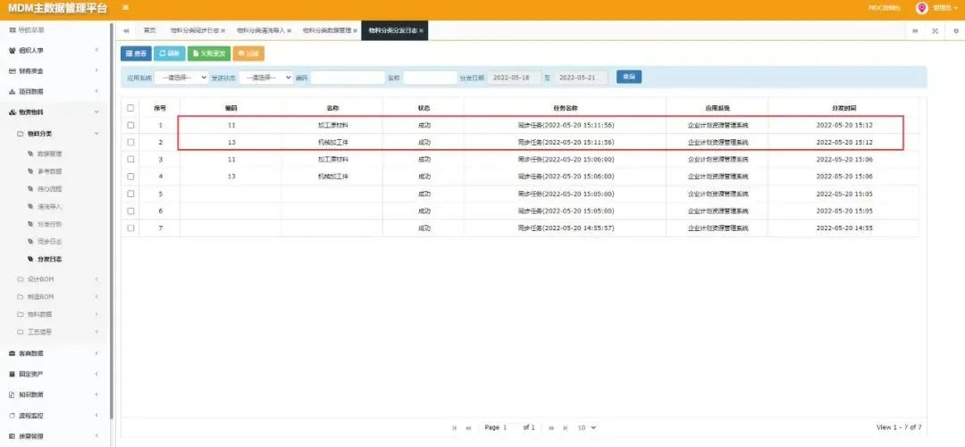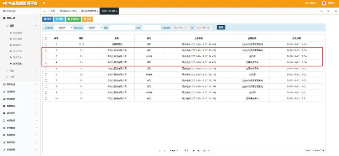 可以在分发日志中查看同步效果,如图(在样例中不做向主数据分发,在这里是为了演示数据没有发送成功的效果):
