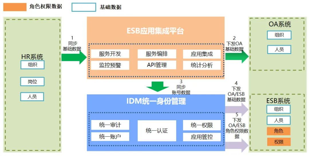 1.以HR为数据源头,提供组织、岗位、人员等基础数据,由ESB为扩展组织、岗位、人员的数据提供服务,再通过ESB的应用集成同步至IDM平台;