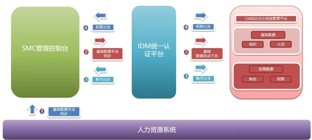 IDM权限数据分发至OA、ESB系统进行授权登录。