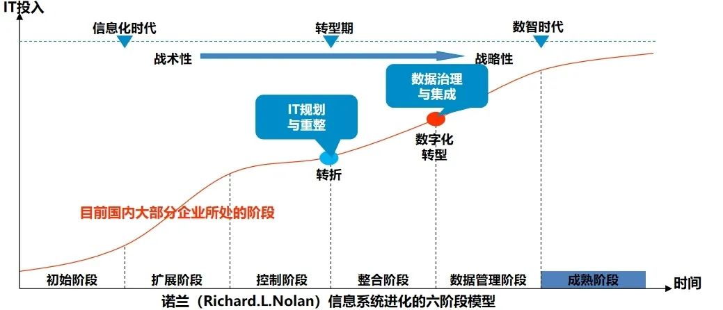 企业信息化是一个逐步发展的过程,从欧美等信息化启动比较早的国家来看,信息化的实施和应用都不能一步到位,而是通过循序渐进的过程逐步建立起来的。企业信息化有一个从初级阶段到中级阶段、再到高级阶段的发展过程。在计算机应用的初级阶段,人们容易从文字处理、报表打印开始使用计算机。进而围绕一项项业务工作,开发或引进一个个应用系统。这些分散开发或引进的应用系统,一般不会统一考虑数据标准或信息共享问题,追求实用快上的目标而导致信息孤岛不断产生。