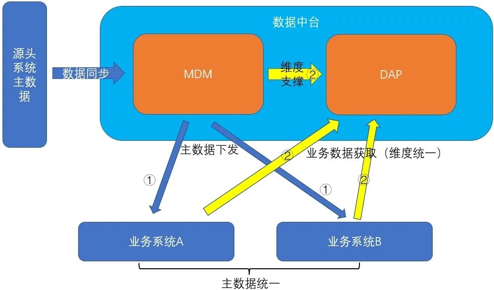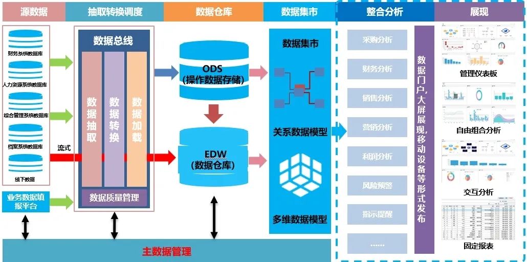 数据中台主要帮助企业进行全链路业务、全生命周期的数据管理,基于建立在数据仓库和数据平台之上,通过数据清洗导入、数据同步/分发、数据处理、分析等技术,对企业内外部海量数据进行采集、存储、计算、加工、分析等,从而为企业的业务决策提供数据方面的参考,用数据为公司业务、营销、管理赋能。数据中台主要是打通企业的数据环节,实现全生命周期的数据管理,通过数据中台建设数据管理体系,实现各个业务系统数据的有效整合,通过基础数据治理保证底层基础数据的一致性,基于业务指标进行前端的动态展现,结合数据指标的多维度穿透,实现以不同形式、不同维度的分析展现。分析业务指标的同时也是对企业业务的梳理,发现业务中存在的问题,实现企业业务升级与转型,保证领导层能实时把控企业业务的发展,了解业务痛点,改进业务管理方式,实现业务与数据的相互支撑,从而为企业的高层决策提供数据支持。数据中台在通常情况下只对数据进行消费,所以在数据分析或数据治理过程中,业务数据及相关主数据都会从其它业务系统中抽取,通过企业数据总线对业务数据及基础数据进行数据的加工或数据同步,在数据分析过程中由主数据作为标准的数据分析维度,业务数据与主数据加工汇总后作为分析模型的数据分析指标最终进行数据的展现。1.数据中台中每类主题需要分析的业务数据,都会有对应的来源系统作为数据源头;2.通过提供从库或直接获取数据表的访问权限,通过ESB进行数据抽取将需要分析的数据同步至ODS中;3.将统一的标准主数据(组织、人员等)进行基础数据的治理,进行主数据的建模、主数据的清洗等,将这些数据下发至下游系统中;4.主数据中的数据作为数据分析的维表同步至数仓中;5.最终维表、ODS表通过汇总、分析、计算等实现数据整合,以及最终的图形化展现。数据中台进行主数据管理,在数据分析过程中通过抽取源头系统的业务数据与主数据系统中的维度数据,通过数据总线对数据进行加工汇总,通过业务系统→ODS,ODS→数据仓库,数据仓库加工汇总后对业务指标整合分析最终进行可视化展现: 1.由业务系统提供业务数据,ESB通过数据集成、业务系统接口调用或者DAP通过读取源库等方式,将源头系统的业务数据抽取到ODS中,其中MDM主数据平台提供基础数据,业务系统提供业务数据;2.ODS中的基础数据、业务数据,通过ESB的聚合流程按照类别汇聚到数仓的维表或事实表中;3.维表与事实表中的数据根据业务主题、业务指标,再次进行加工汇总,形成数仓中的汇总事实表;5.结合分析模型整合计算的数据与DAP预置的展现组件,形成直观的图形、图表展现,最终配置成各类展现看板、报表等,完成可视化效果的最终呈现。数据中台在进行数据分析前,首先要打通企业的基础数据管控,解决企业之间的信息孤岛,保证企业各个业务系统之间的基础数据统一。通过打通企业系统之间的信息孤岛,保障各个业务系统之间的基础数据统一,在后续进行业务数据采集时保障维度的统一,也为数据的总结分析打下重要的基础。为什么说企业在做数据分析的过程首先就要做到基础数据统一呢?首先在主数据没有治理、业务系统没能有效集成,数仓建设、数据服务体系没有成功搭建的情况下,上大数据平台、数据湖项目要么是厂商收智商税、要么是客户缴学费。在上面也提到了,各个业务系统之间随着企业的迅速发展是存在信息孤岛的情况,只有做到企业的基础数据统一,保障各个业务系统之间最基础的数据统一,才能首先保障业务系统之间的对接。1.比如一家企业的工程建筑系统和档案系统进行集成,他们之间的共性就是对应的项目办之间是相同的,而如果没有做好基础数据统一,那么两个系统之间的项目办可能名称、编码等都不一致,集成起来非常困难,并且如果后续进行数仓建设,两个系统之间没有统一的基础信息,就会导致数仓构建非常困难,无法做到统一的分析维度。所以数据中台的基础数据建设首先就是要保障各个业务系统之间的基础数据统一。2.其次便是基础数据统一的第二个作用,分析维度的统一。将企业的各个业务数据采集后进行分析,首先就是要保障一个分析维度。基础数据统一就会保证业务数据在采集时他们之间的维度就会统一,而这时,将主数据中存储的基础数据作为DAP中的维度数据,大大减少了后续数仓建设对于数据的筛选和映射的工作。前文解释了企业数据分析过程首先是进行基础数据的统一,在基础数据建设完毕后,在进行业务数据的采集。而在一个企业中,业务数据是可以划分为多个主题进行建设。针对不同分析主题采集不同的业务数据,但是在这个过程中会出现不同类型的数据情况。1.在业务数据采集之前,我们会进行主数据的下发,保障各个业务系统的基础数据统一,之后再采集业务系统中的业务数据,结合我们的ESB可进行多种的数据采集方式,如接口对接,定时拉取等保障数据的采集。业务数据存储到我们的数仓中后可根据之前建设好的统一的基础数据作为分析的维度。2.在业务数据采集时,也会存在业务系统提供的数据是他们系统已经分析好的数据,或者他们的数据相对独立,与企业的基础数据无任何关联,针对这种业务数据,首先就要与业务系统明确每条获取的数据的唯一字段或如何通过多个字段构成的唯一字段信息,将