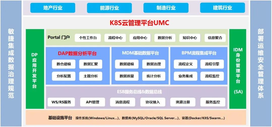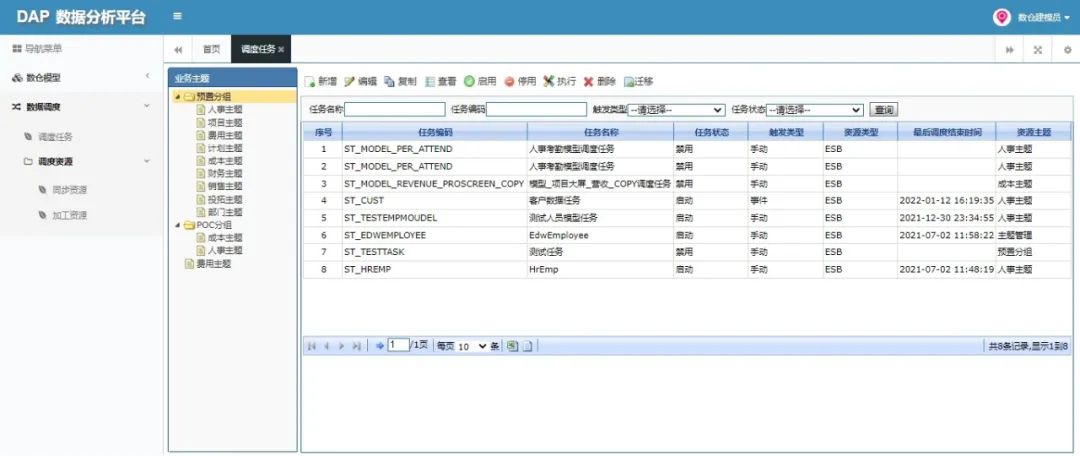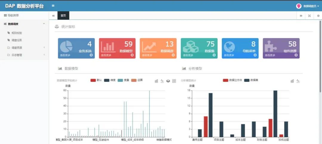 DAP数据分析平台就是采集各个业务系统的数据,进行数据筛选(表和字段、数据)、质量校验等步骤建立数仓,保证了数据标准性、完整性、准确性,从而实现企业业务数据的统一,通过数据可视化展现、数据服务来展现DAP数据分析平台的价值。我们数通畅联的所有产品都是通过K8S云平台进行部署搭建产品环境,通过不同的产品组合方案来解决企业面临的不同信息化困境,帮助企业完善信息化发展。如上图所示,通过DAP数据分析平台+MDM基础数据平台+ESB企业服务总线组成了数据中台方案,本次介绍的DAP数据分析平台就是此方案的核心,基础数据进行主数据治理,DAP数据分析平台进行业务数据治理,通过ESB进行数据的集成,帮助整合企业数据,统一管理,提升企业的数据价值。数据分析平台全生命周期是通过采集各个业务系统数据构建数仓,从而进行有效分析的过程,能够真实、准确、有效地将企事业内部及行业外部相关数据进行可视化展现,帮助企事业提升行业洞察力,加强决策力,从而提升整体竞争力。1.数据来源(应用系统定义、数据源头配置、ODS数据定义)数仓模型。2.数仓模型(业务主题、维度配置、事实配置、模型配置、指标管理)。3.数据调度(规则校验、调度资源(同步资源、加工资源)、调度任务、调度日志(同步日志、加工日志)、质量日志、通知日志)。4.分析模型(数据集配置、立方体配置、业务类报表、多维度分析)。5.展现模型(导航管理、组件管理、展现主题、装饰管理)。6.数据服务(接收服务、查询服务、统计服务、指标服务、业务服务)8.统计分析(数据地图、质量分析、血缘分析、影响分析)。9.系统管理(组织管理、角色管理、人员管理、功能管理、编码类型、编码管理、系统日志)。DAP数据分析平台通过授权管理进行角色授权、配置授权、业务授权进行三权分立,通过角色授权为DAP授不同角色,不同角色进行配置不同的访问权限,配置权限是数据治理配置部分,进行数仓的建设、分析模型的创建等功能操作权限,DAP业务权限就是数据可视化,数据服务、数据画像等权限的分配。DAP权限分为角色授权、配置授权、业务授权,不同角色操作不同的功能,从数据治理、数仓建设、可视化分析来梳理各个业务系统的业务。角色授权对登录账户分配角色,分配管理角色、查看角色、审计角色、配置角色等,不同角色能够查看或者操作不同的功能,通过不同角色来进行DAP全生命周期的建设。配置权限是只从数据来源到数仓模型的建设、然后通过数仓模型创建分析模型,再通过分析模型配置可视化分析导航和数据服务。DAP业务数据主要是数据服务接口授权和导航管理可视化分析展现授权,数据服务授权主要是不同角色能够访问不同主题下的数据服务,可视化分析展现权限分配是不同角色能够访问不同的导航和导航下不同主题。上述所说角色授权是账户分配不同角色,下面是对角色授权的具体介绍。角色授权是对用户进行分配角色、分配权限,通过不同角色来进行分级、分类授权,不同人员做不同事情,这样就避免不同人操作同一个功能,导致配置冲突,导致数据不准确。DAP数据分析平台有数据源配置员、数仓建设角色、数据集成角色、展现与服务配置角色、业务使用角色、权限配置角色、系统管理员。配置权限是进行数仓建设、数据集成、分析模型、展现配置等功能的操作管理权限,以下是配置授权的具体介绍。通过配置权限来进行分级、分类访问不同的功能,找到更加适合角色来访问操作不同功能,各司其职,这样能够加快数据分析平台的建设,配置权限分别有数据来源角色、数仓建模角色、数据集成调度角色、展现及服务配置角色。业务授权分为业务管理权限,业务管理权限是实现不同用户能够查看到不同主题的可视化分析展现,审计权限是对数据治理的过程进行审计监察。通过导航功能授权管理进行配置导航权限,配置后该用户就能够访问这个导航。然后在通过导航的菜单授权实现不同账号访问不同的主题页面。在实际应用中,数据分析可帮助人们做出判断,以便采取适当行动,所以数据一定是标准的、完整的、准确的,通过上述质量校验功能把业务系统中不正确数据过滤掉、调整后,使数仓中的数据具有可用性,这样分析出来的信息才能正确引导公司的发展。从平台的角度来说,实施分类分级管理后,将会清楚自己是哪一级、哪一类,有望按照不同类不同级的相关要求加强自身规范化建设,这既为平台自身管理明确了定位和方向,也表明了平台责任,促进平台完善管理,保证数仓中数据具有完整性、准确性,这样无论数据服务和数据可视化展现都会提升企业数据价值。从用户角度来说,分类分级管理之后,由于平台比以往管理会更加规范化,可减少各种违规侵权现象,用户选择、使用平台会更加放心。数据分析平台应用分为可视化展现和数据服务的提供,通过数据可视化,业务组织可以提高他们在需要时查找所需信息的能力,也通过数据服务对外提供服务,业务系统可以通过服务抽取数据来保证系统的运行,企业中数据统一管理,统一规划。DAP数据平台是我们数据中台的一部分,数据中台也是看作dPaaS,通过PaaS构建SaaS,PaaS平台可以根据自身优势采用与SaaS应用合作的模式,最终让SaaS应用的交付结果更具有行业适配能力。在未来企业数字化转型中“平台+应用”成为