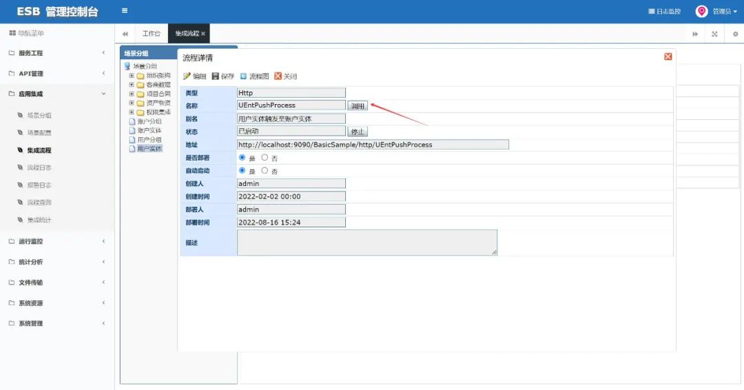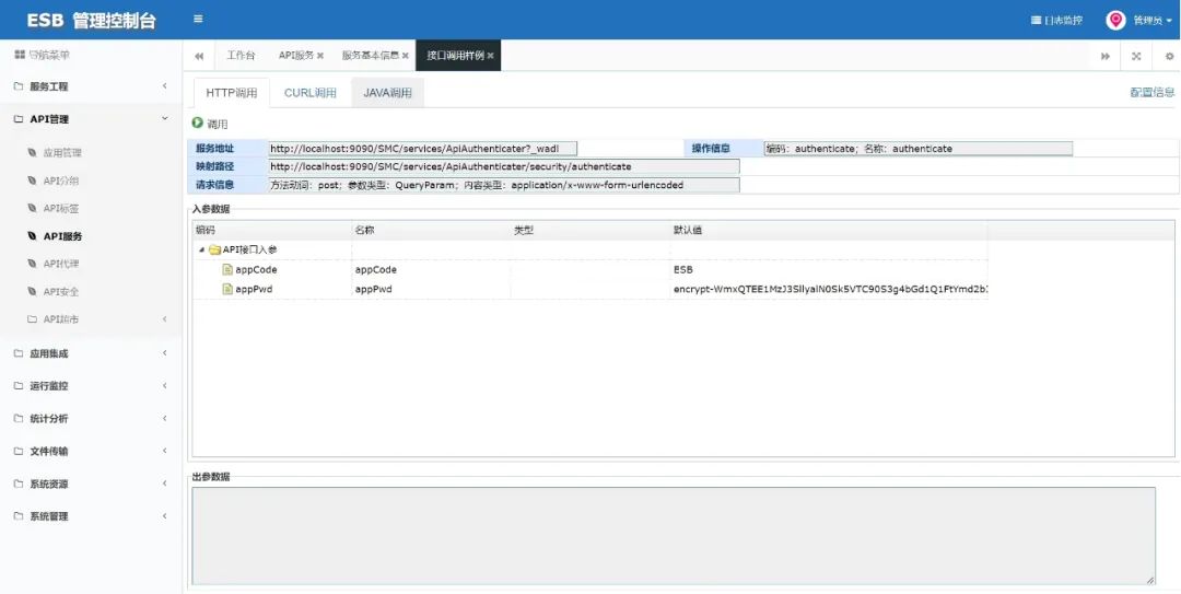 AEAI ESB作为我们公司的一款核心产品,用于解决各个业务系统之间的异构集成难题。对于服务流程的集成调用在产品中也是一个很重要的功能,为了方便对于产品的整个使用感受更流畅,对于调用功能进行重新调整,对不同类型的服务和流程都可进行调用。现对ESB产品服务接口和集成流程不同场景下的调用功能进行分析总结。本篇文档将对于SMC控制台中的调用场景,整体进行介绍说明,方便后续客户以及公司同事进行调用功能的使用。在使用的过程中,也希望其他人提出意见,从而使调用功能可以更加完善。为方便客户减少打开其他调用软件的次数,在SMC控制台内可直接进行接口与流程的调用查看,对于HTTP调用页面和流程调用页面都进行了调整,本篇文档将对于调整后的调用模块功能进行调用操作的说明。调用功能主要分为两种,一种是服务接口的调用,另一种是流程的调用,而流程的调用又分为集成流程和HTTP流程。对于服务接口调用,主要是主要在API管理的调用模块中,接口若要调用成功,需要进行如下步骤的操作,在后面的文档(服务调用部分)中会详细介绍说明。流程调用分为两块,集成流程的调用主要在应用集成模块,流程调用需要对入参进行配置,不同请求类型的入参设置不同,具体的操作在后面文档中(流程调用部分)也会详细介绍说明。普通HTTP流程的调用可在服务工程中的消息流程进行调用,也需要配置入参。具体调用方式跟集成流程一样。服务调用是将程序的执行交给其他的代码段,通常是一个流程或者接口,同时保存必要的信息,从而使被调用段执行完毕后返回到调用点继续执行。当操作系统不允许用户直接操作各种硬件资源时,用户程序只能通过系统调用的方式来请求内核为其服务,间接地使用各种资源。IP地址提供了在互联网上找到这台机器的凭证,协议以及服务端口提供了在这台机器上找到提供服务的进程的凭证,根据IP地址在互联网上查到要访问的服务所在的机器,根据协议和端口查到服务进程,再根据服务名查询到对应的服务,完成服务调用。当浏览器向Web服务器发出请求时,它向服务器传递了一个数据块,也就是请求信息,HTTP请求信息由以下3部分组成:1.请求方法URI协议/版本:请求的第一行是“方法URI协议/版本”。例如:GET/sample.jsp HTTP/1.1。以上代码中“GET”代表请求方法,“/sample.jsp”表示URI,“HTTP/1.1代表协议和协议的版本。2.请求头(Request Header):请求头包含许多有关的客户端环境和请求正文的有用信息。例如,请求头可以声明浏览器所用的语言,请求正文的长度等。3.请求正文:请求头和请求正文之间是一个空行,这个行非常重要,它表示请求头已经结束,接下来的是请求正文。请求正文中可以包含客户提交的查询字符串信息,如:username=jinqiao&password=1234。在以上的例子的HTTP请求中,请求的正文只有一行内容。当然,在实际应用中,HTTP请求正文可以包含更多的内容。在服务工程模块是通过设计器创建工程后在SMC管理控制台服务工程模块才可以看到工程列表,点击具体某个工程后会显示当前工程的基本信息、Web服务、消息流程,也可以通过本界面来管理工程。在该模块场景下可以对创建的工程应用中的流程进行调用,并可对服务流程进行启停操作。调用位置可在消息流程中调用,选择一个流程就可进行调用。该弹窗可以对调用流程的入参信息进行填写,调用后可查看相应输出的内容。HTTP流程的调用也可以直接选择工程的MF服务下的流程进行直接调用。点击“调用”按钮会弹出对应流程的手动调用页面,调用后可查看相应输出的内容。在服务工程中只可对类型为“Http”的流程进行手动调用,对于所有类型的流程,可以对流程进行“启动”和“停止”。选择一个http流程进行调用,填写入参,并点击调用按钮,展现调用结果如下。API服务是在SMC管理控制台的API管理模块下的功能页面,API服务功能主要是对是将各个系统的服务在ESB进行管理的模块,管理的方式包括导入、注册和配置。ESB产品中的服务调用也可对这些服务进行调用,共有四类,分别是导入、注册、代理、配置服务。在API服务中,不同服务的调用位置都是在对应服务的接口中,有两个方式进到调用页面。第一种方式,在API服务可先选择一个服务,点击进去。来到服务的API列表页面,选择调用的服务接口,再点击“调用样例”按钮。可以直接跳转到接口的调用样例页面,该部分有三种调用,分别是HTTP调用、CURL调用、JAVA调用。HTTP调用页面显示接口信息,可以支持调用;CURL调用中CURL是一个利用URL语法规定来传输文件和数据的工具,支持很多协议,如HTTP、FTP、TELNET等,在CURL调用页面中的调用URL的语句就可以直接在服务器中调用。JAVA调用页面,可直接复制JAVA代码,粘贴到开发工具类中调用,也可直接下载工程,把工程放在设计器的workspace文件夹,导入到设计器即可。第二种方式是可直接双击进入API列表服务接口的基础信息页面。在接口基本信息页面点击右上角的“调用样例”标签按钮,同样可以来到接口调用样例的模块。对于想要调用的接口进行入参出参的配置,入参和出参有不同的创建方法,下图为模板创建。接下来对配置好的接口进行调用展示。以Web服务的服务查单条接口为例,点击接口基本信息页面的“调用样例”,来到调用页面。如果入参显示方式为“文本”,需调整入参数据,再点击“调用”