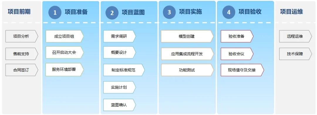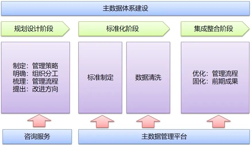 主数据管理的实施不是搭建一个主数据管理平台就能达到的,而是一项长期、复杂的工程。其中制定主数据标准是基础,规范主数据内容是过程,搭建主数据管理平台是技术手段,建立组织机构和流程是前提和保障。主数据管理实施一般包含项目准备、项目蓝图、项目实施、项目验收等四个阶段。