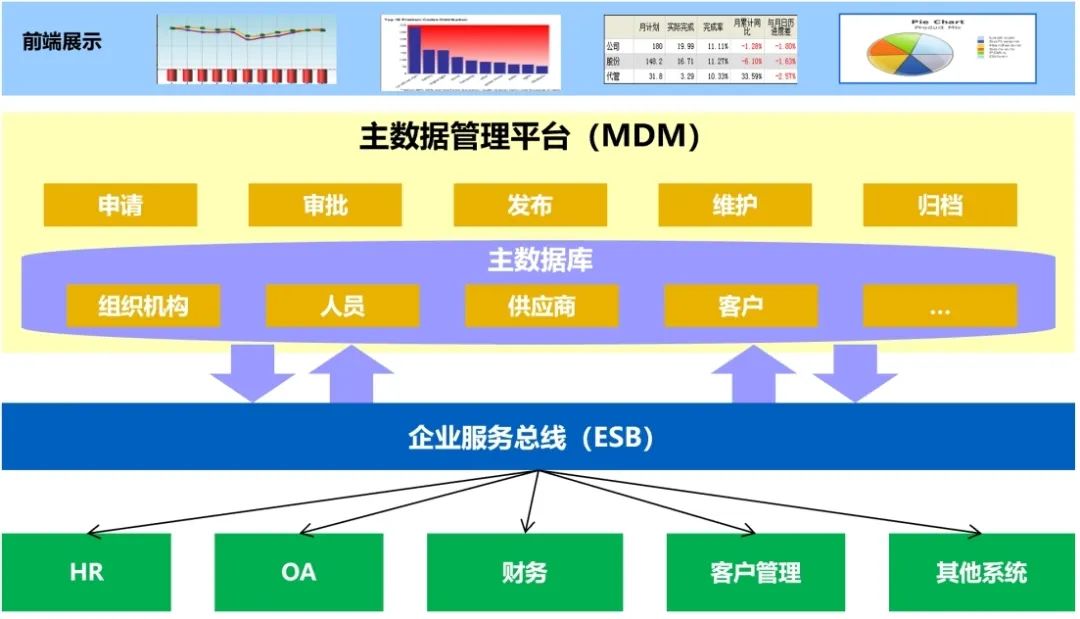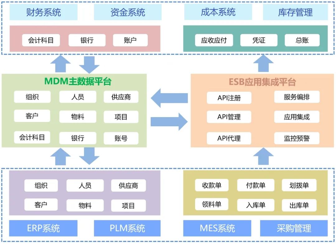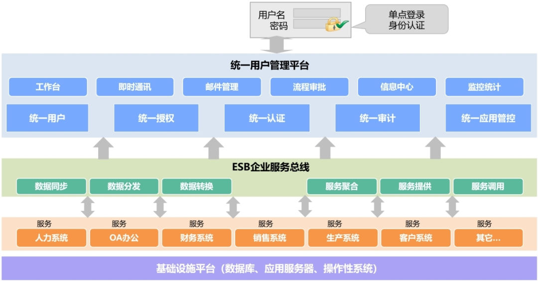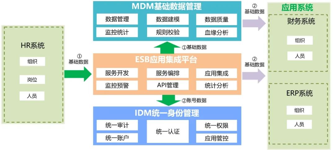 集成底座方案主要是基于IDM统一身份管理平台、MDM基础数据管理平台和ESB企业服务总线平台三款产品组合形成的解决方案,主要是从企业信息化建设的角度出发,搭建基础的信息化平台,构建统一、标准、柔性、可复用、可扩展的IT架构,解决企业信息化建设过程中缺乏整体规划、集成整合难度大、安全管控不到位等问题。