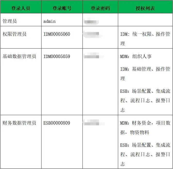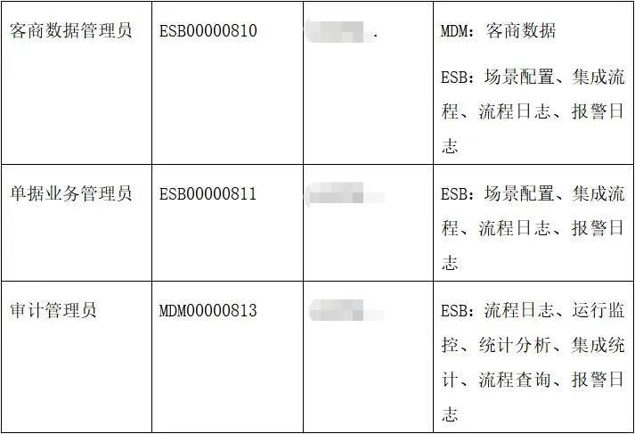 集成底座方案的集成主要是基于IDM和MDM作为数据的集中维护平台,通过ESB进行服务API的管理,构建集成通道,从而实现IDM、MDM以及上下游系统的打通。由业务系统作为基础数据的源头,这些基础数据通过ESB同步至MDM平台进行统一管理,保证基础数据的准确性、唯一性、完整性;MDM将组织、人员等基础数据分发至IDM生成对应认证账号信息,用于支持统一认证等业务;整个集成过程中,ESB作为服务总线负责对各个系统的接口和服务进行注册和管理,同时构建系统数据对接的集成流程。集成底座包括三个子方案,分别是IDM+ESB统一身份5A管控方案、ESB+MDM统一集成平台方案和MDM+ESB主数据治理方案,本次IPOC集成底座是将三个子方案相结合。1.ESB+MDM应用集成方案:主要目的是通过集成底座平台打通系统间业务单据集成的难题,主要面向各个系统的业务数据,如财务单据、财务凭证、收款单/付款单、入库/出库单等。由业务系统提供标准化的业务单据接口,ESB将接口注册到平台,构建API注册中心,实现对API的管理、监控、测试、预警等,同时通过应用集成进行服务接口编排,实现系统单据的集成。2.IDM+ESB统一身份方案:主要以权威的业务系统为源头,将组织、角色、用户等信息经过MDM平台治理后,同步到IDM平台,基于同一的用户信息完成统一认证;根据需求在IDM平台进行业务角色、权限角色的统一管理与权限分配,再通过IDM分发到对应的业务系统中,实现权限的统一;作为5A安全管控平台,IDM提供的密码策略、认证策略、监控预警、统一分析、业务系统注册与管理等功能能充分满足企业系统集成的需求。3.MDM+ESB基础数据方案:以MDM为核心实现基础数据的全生命周期管理,将各个业务中的基础数据同步到MDM平台,并完成相关的数据清洗、统一、编码等,再将治理后的数据分发到下游系统,从而实现各个系统基础数据的同源、统一、准确,为后续深度的业务集成、数据分析、数据挖掘奠定基础。1.通过源头HR系统把组织、人员、岗位同步到主数据平台;2.通过主数据凭平台把组织、人员、岗位信息分发到财务、ERP、IDM系统(注:IDM是在账号数据)。2.下游业务系统(ESB、MDM、Portal)接收IDM平台所下发的账号信息;1.其他业务系统通过调用IDM功能菜单导入接口把菜单信息注册到IDM平台;2.IDM平台配置各个业务系统角色、权限信息通过ESB同步到其他业务系统进行账号授权实现统一权限;1.以ERP为数据源头,提供客户、供应商、银行账号并进行数据的同步,在主数据中将该三类主数据分发至财务系统中;2.以MDM为数据源头,提供组织、人员、物料、产品并进行数据的分发,将该四类主数据分发至ERP系统与财务系统中;3.以财务系统为数据源头,将核算项目、会计科目分发至MDM系统中,在MDM中进行存储,不进行下发。单据集成为ERP系统与财务系统之间的单据集成和凭证集成,通过ESB进行单据凭证的生成和数据的映射:1.获取ERP系统中的收款单或付款单,通过ESB进行数据映射,然后将映射数据同步至财务系统中的应收单和应付单中,成功后把成功状态回写给ERP;2.在ERP系统中将收款单和付款单组合成凭证信息,通过ESB将凭证信息映射为财务系统的凭证写入接口的入参,同步至财务系统中后将同步成功信息回写给收款单和付款单。内部IPOC演示说明文档主要为公司新进人员以及集成底座项目人员学习与参考。内部IPOC集成底座样例需要多场景多机制下的集成流程进行演示,本样例模拟发送和接收接口进行场景配置,创建集成流程完成数据同步,再配置服务以及流程的安全报警机制,调用查看运行监控和日志等,完成整个样例的演示。首先IPOC集成底座对两个样例进行了工程重新规划,ESB+MDM预制样例拆分成单据集成工程和基础数据集成工程,单据集成工程包括付款单、收款单、以及凭证方面的服务与流程,基础数据集成工程包括组织、人员、岗位、客商、供应商等等主数据操作的服务与流程,IDM+ESB预制样例调整为IDM集成工程,主要增加了对Portal和MDM系统的权限与账号的分发。为了更完备的模拟在项目中的使用场景,对于菜单进行授权,根据不用的角色要配置不同的菜单功能权限,所以预置如下角色。在IPOC集成底座样例中,对于各个系统分配了不同的角色,IDM分为数据管理员和权限管理员,ESB集成场景模块分为基础数据管理员、财务数据管理员、客商数据管理员、业务单据管理员、审计管理员,MDM分为基础数据管理员,财务数据管理员,客商数据管理员,管理主数据当中的一些基础数据Portal默认管理员角色,普通用户都从Portal门户集成平台来登录。具体在样例中则根据不同角色创建了六个不同的人员,都是由管理员进行权限设置。其中各个系统管理员需要在功能配置中的安全配置,配置各个角色的功能权限。演示时,使用服务器IP地址进行访问,并登陆不同的人员角色账号进行演示,每个人员账号密码如下:1.分角色操作:样例中不同系统创建了不同角色,MDM(基础数据管理员、财务数据管理员、客商数据管理员)、IDM(基础数据管理员、权限管理员)、ESB(基础数据管理员、单据业务管理员、财务数据管理员、客商数据管理员、审计管理员)、Portal。介绍每个人的角色,查看不同人员对应可操作的功能菜单。2.基础数据同步:从源头HR系统将主数据(组织、人员、岗位)同步至集成底座进行管理,同步之后在主数据平台查看数据是否同步成功,日志是