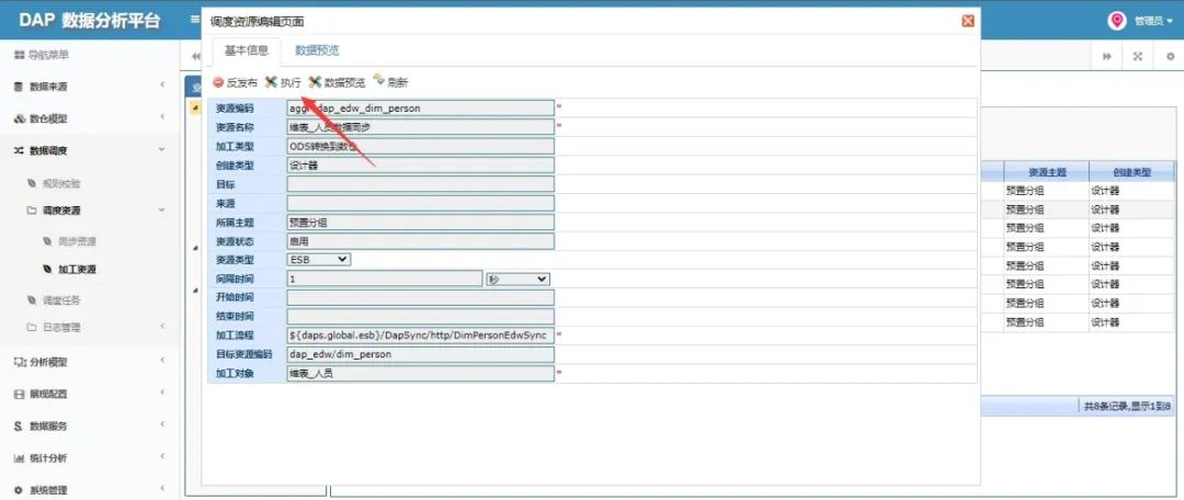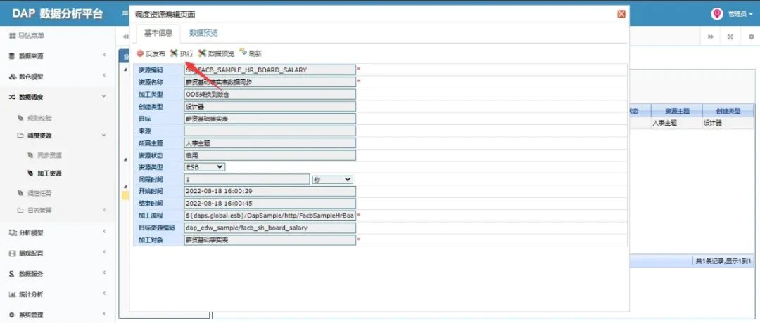 DAP数据分析平台就是通过企业中的数据构建数仓,把从业务系统中获取的数据进行高效采集、校验、计算等操作,将有价值的数据以可视化或者数据服务的形式进行展现或者提供出去,能够帮助企决策者可用通过分析出来的信息调整企业策略,加快企业的信息化发展与整体竞争力。DAP数据分析平台就是采集各个业务系统的数据,进行数据筛选(表和字段、数据)、质量校验等步骤建立数仓,保证了数据标准性、完整性、准确性,从而实现企业业务数据的统一,通过数据可视化展现、数据服务来展现DAP数据分析平台的价值。首先介绍DAP的数据中台方案组合框架:数据中台方案方案主要是的产品组合DAP+MDM+ESB这三款产品组成。DAP数据分析平台与ESB应用集成平台结合生成对应的业务系统到ODS、ODS转换到数仓、汇总事实表加工流程,通过执行调度任务调用ESB数据同步流程,实现数据的采集、抽取、校验等操作。通过MDM基础数据管理平台来管理各个业务系统的基础数据,为DAP提供同源并标准的、一致的基础数据,保障数据分析维表数据的准确性。最后可以添加Portal门户集成平台这款产品,通过页面集成方式基础DAP可视化展现,也可以通过数据服务提供数据构建其它的展现方式。数据分析平台全生命周期是通过采集各个业务系统数据构建数仓,从而进行有效分析的过程,能够真实、准确、有效地将企事业内部及行业外部相关数据进行可视化展现,帮助企事业提升行业洞察力,加强决策力,从而提升整体竞争力。1.数据来源(应用系统定义、数据源头配置、ODS数据定义)数仓模型。2.数仓模型(业务主题、维度配置、事实配置、模型配置、指标管理)。3.数据调度(规则校验、调度资源(同步资源、加工资源)、调度任务、调度日志(同步日志、加工日志)、质量日志、通知日志)。4.分析模型(数据集配置、立方体配置、业务类报表、多维度分析)。5.展现模型(导航管理、组件管理、展现主题、装饰管理)。6.数据服务(接收服务、查询服务、统计服务、指标服务、业务服务)8.统计分析(数据地图、质量分析、血缘分析、影响分析)。9.系统管理(组织管理、角色管理、人员管理、功能管理、编码类型、编码管理、系统日志)。质量校验是对数据的一种清洗,把不规范的、不正确的、不完整的数据找出来,把数仓中的数据变成具有完整性、准确性的数据,这样就在DAP分析、汇总时候才是表达出真实的有效的,才能体现数据的价值。DAP质量校验功能主要是在DS到维度表质量校验、ODS到基础事实表进行质量校验,因为业务系统到ODS主要是选择表的过程,而汇总事实表是需要汇总计算的所以数据一定要校验后的数据,所以质量校验就在中间环节进行的。DAP中ODS到数仓是需要进行数据质量校验的,这样才能保证数据准确性,才能保证数据在数仓中是准确完整的,这样数据应用才能发挥价值。ODS到数仓主分为到维度表和到基础事实表,主要是对字段的筛选,通过数仓的数据进行应用处理的,所以数仓里的数据需要进行质量校验,质量校验分为ODS到维度表质量校验、ODS到事实表质量校验,通过校验接口把校验信息插入到质量日志中,从而进行清洗数仓数据帮助数据准确性。维度表是通过ODS中找到适合维度分析表进行定义创建的,校验通过配置字段校验规则,然后在ESB选择维度的集成流程创建会自动生成一个支持质量校验的抽取数据流程,通过流程把ODS数据进行校验(不规范的、不正确的、不完整)的数据剔错插入到质量日志中,其他清洗后的数据才同步到维度实体表中。事实表分为基础事实表和汇总事实表,上述所说汇总事实表是进行汇总计算是需要清洗后的数据,所以质量校验是在同步基础事实表中完成,也是同样需要配置校验字段,然后生成对应的ESB集成流程,通过流程把(不规范的、不正确的、不完整)的数据插入到质量日志中,其他清洗后的数据才同步到基础实体表中。上述所说维度校验是从ODS到维度表同步数据时候进行校验的,通过维度表校验配置过滤错误的数据,保证同步到维度表的数据具有完整性、准确性。维度表的来源是ODS,是在ODS选择表和字段的过程,选择适合维度表和字段,因为ODS是从各个业务系统中直接拉取的全部数据,业务系统中数据可能存在历史残留或者手工录入错误的数据,所以为了保证数据分析出来是准确的,所有同步维表时候是需要校验的,下面是如何配置定义维度表和集成流程质量校验的过程。(2)编辑页面:选择来源表(支持多表),配置层级策略指标需要的配置和日志标题。(3)选择表后进行导入字段,添加字段只能选择来源表的字段或者自己手动添加:1.首先添加一个http调用组件用了获取配置的校验规则的。出参是:jsonObj (在全局变量中定义、类型是java.lang.String)