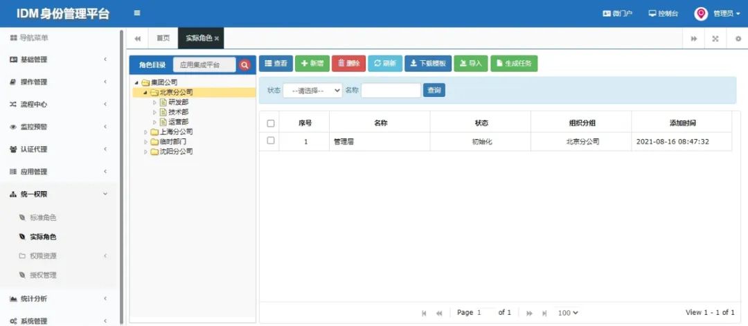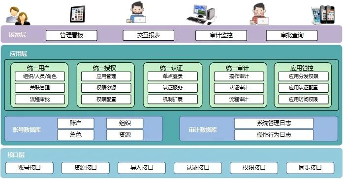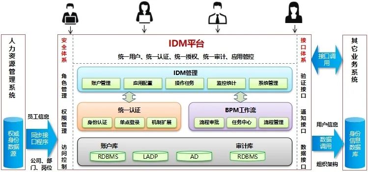 IDM身份管理系统为解决企业内部多系统之间的用户信息不一致而开发的,主要定位于解决企业在5A功能上的需求,即:Account账号管理、Authentication认证管理、Authorization授权管理、Audit审计管理、App Control应用管控5个方面的实际需求,进而规范用户身份信息,保证系统安全,提高工作效率。