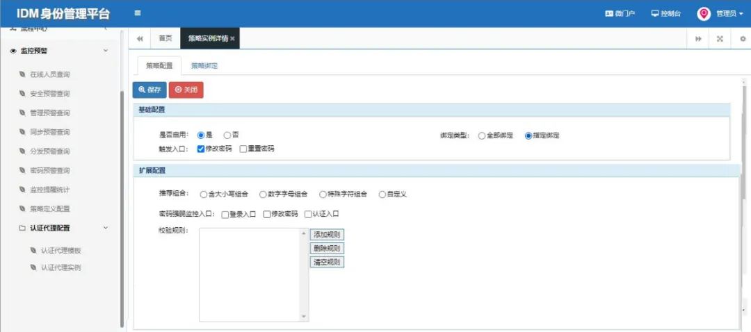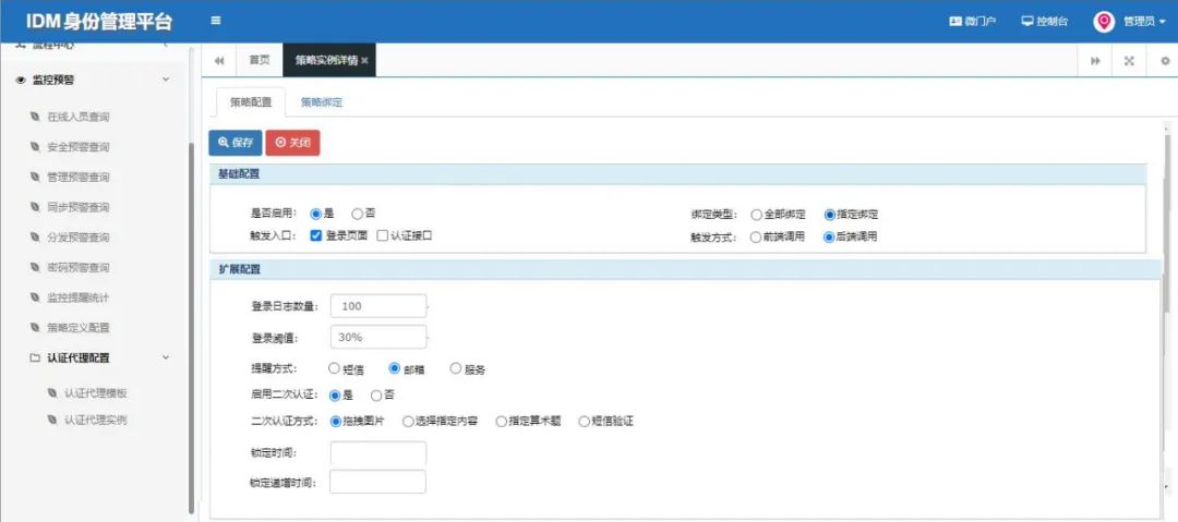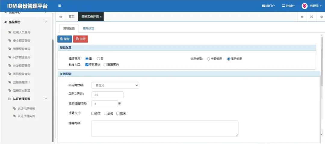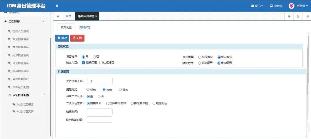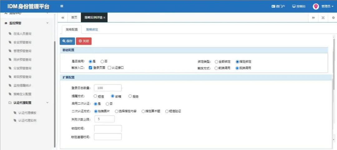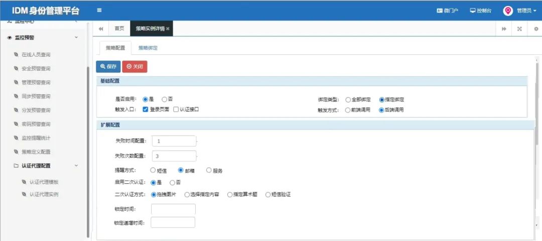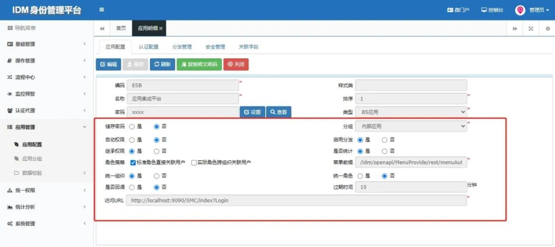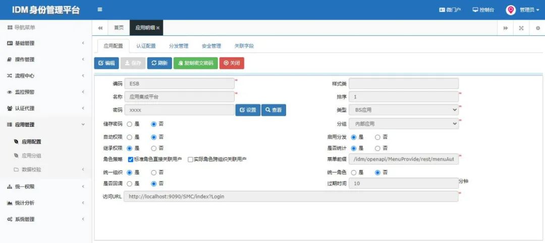介绍了开关策略的优势,接下来我们通过应用配置、策略配置以及全局变量中的开关变量来体验开关策略给产品带来的提升。首先,我们来介绍5A中应用管控所涉及到的应用配置功能的明细配置页面。首先,我们对该功能页面上所涉及到的属性做简单的介绍。我们以上面的大标签为例,如下:其中,应用配置为基础的应用管理信息,认证配置为对CAS、Oauth以及表单认证的配置,这里我们IDM主推采取Oauth认证的方式,分发管理,为IDM分发数据的策略,包括分发方式、自动分发、分发URL。安全管理为对应的应用系统权限,如上图,安全管理中设置的人员,将会拥有ESB的权限。关联字段可以设置属于该应用系统的拓展字段,为特定的应用系统设置特定的权限。对于应用配置,我们就以IDM 5A管理中的统一用户以及同意权限为例,进行介绍,也就是在IDM中如何进行配置才能把上有系统同步到IDM中的数据,通过一系列的配置在把数据分发给下游系统。同时,我们也可以在应用中设置为统一角色,这样IDM的标准角色将转变为IDM中的权限岗位,也就是在统一角色后,我们的标准角色数据将转变为权限岗位数据。那么接下来介绍要实现这两种场景我们要在IDM,中如何进行相关的配置。首先,我们先来介绍基本的数据的下发过程,这里我们需要了解应用管理的基本信息中的一些属性,如下:图中所标出的几个属性便是需要配置的几个属性。当我们在进行数据下发的过程中,我们需要对基础数据进行下发权限的配置,这里我们除了在相关的位置进行选择应用系统的设置外,我们应用系统管理也提供了两种权限配置的方式:一种是自动权限、一种是继承权限,这里自动权限,代表我下发的数据自动带有下游系统的权限,继承权限则是当我没有给下发数据赋予权限时,他会默认去找其父节点带有的权限并继承下来,这里我们以组织数据为例,如下:如上也就是当我给研发部配置权限的时候,当我的北京分公司被赋予了对应应用系统的权限,那么我们下发研发部的时候,他就会带上北京分公司的权限。接下来是角色策略,这里需要注意一点,上面的相关权限是否与统一角色无关,但是角色策略统一角色以后将无法进行使用,这里统一角色后,角色并不专属于某一个应用,而是IDM中的权限岗位。这里当我们在未统一角色的情况下,我们选中标准角色直接关联用户后,我们可以在标准角色中直接关联相关的用户,标准角色的明细页面会多出一个标签,如下:而另一个实际角色的策略选中后,相对应的实际角色明细中可以挂的人员将不再只是该组织下的,而可以是其他所有组织下的人员。点击实际角色进入到的明细页面,明细页面中实际角色可挂的人员树,是所有组织的,如下:除此之外统一组织则是判断下发的数据是否采取与IDM相同的组织,也就是在下发的系统中要有与IDM组织编码一致的组织,如果选择为否,则会调用相应的接口获取下发系统的组织数据。最后统一角色的选择则是切换两种不同的模式,统一角色时下发的标准角色转变为IDM的权限岗位,而非其他应用系统所特有的角色信息。由于我们以统一用户与统一权限为例进行说明,其中还有部分设置在其他功能上,这里就不再进行介绍了,相关的部分开关我们已经进行了详细的说明。上面说完应用配置中的部分设置后,接下来我们来介绍IDM中提供的监控策略,以及监控策略可以满足的场景。首先IDM目前提供了两种监控策略,分别是密码策略和认证策略,后续我们依然会添加更多的策略配置进来,接下来我们先介绍现存的两种策略都可以监控什么情况。认证策略,我们可以对二次认证进行配置、检测用户异时异地的登录情况、配置监控账户被暴力破解、多次登录失败,以及账户锁定的时间设置。密码认证,我们可以对密码的基本规则、拓展规则、密码有效期配置、密码监控策略。下面我们将分场景来说明其中一些开关的配置信息。接下来,我们来指定几个场景,我们将在下一小节,介绍如何使用策略配置出解决特定场景的方案。如下:我们指出的上述四个场景,我们接下来将介绍,如何使用IDM的策略解决上述实际场景的问题。1.接下来我们一一介绍,上小节指出的实际场景,需要如何配置IDM的策略解决,首先是异时登录策略,该策略配置的是当用户在不常用的时间段登录的时候需要进行验证。我们可以看到相关的策略配置信息,有登录日志数量,是否启用二次认证等如下:2.接下来是异地登录策略,和异时登录策略类似,异地是在发现用户的登录ip不是常用ip后,需要进行二次认证,相关配置信息如下:3.然后在平时的使用中我们会面对黑客的攻击,或者蓄意的账号盗取,这样我们需要对暴力破解进行一些设置,如下:在配置结束后,我们在首页进行登录5分钟内超过三次将进行账户的锁死,而账户锁死的设置我们可以在锁定时间配置处进行设置,如下:配置了锁定的时间后,当超出次数后首页将进行账户的锁死操作,而锁定的时长将根据用户自己的设定来执行,同时为防止黑客的暴力破解我们在锁定账户的同时支持设置通知的方式,我们可以在遭遇暴力破解的时候第一时间知道。其余的两种情况为密码策略配置,首先基础的校验规则就是在密码策略的基本规则中使用,具体配置如下:其中左侧的组合就是字面上设置的校验规则,在这里就不再讲解了,右侧的密码监控入口在设置后,我们对密码的校验将