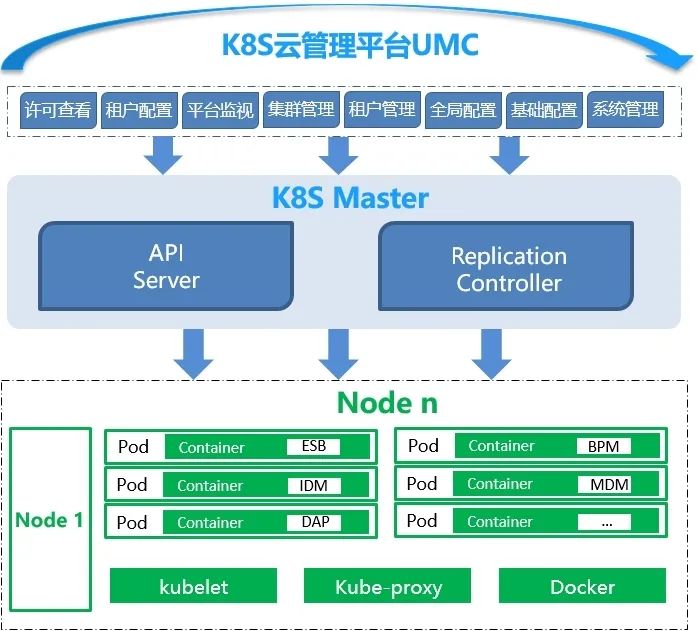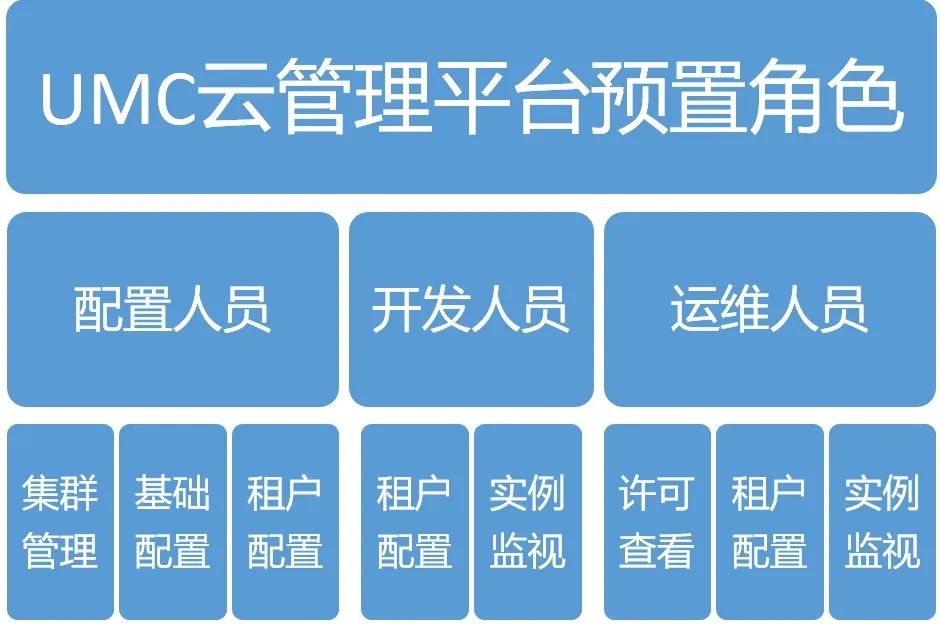 UMC云管理平台用于对公司集成套件的云平台开发、部署、管理、运维进行统一管理,与由不同产品灵活组合形成多种解决方案的容器化套件以及持续集成、持续交付的CI/CD管理机制共同构成 iPaaS平台。本篇文档主要介绍UMC中的预置角色及其对应功能权限。UMC云管理平台支持多租户管控,有效提高使用范围;提供容器在线监视,可查看容器参数、运行状态、容器性能和容器中服务的运行日志;全面支持ESB、DP设计器远程部署功能,通过回写日志,可直观查看容器部署状态,并通过部署结果、错误信息追溯定位原因,便于快速解决问题;支持管理配置多种组合方案、多K8S集群、各种不同的Server,提供典型的平台组合方案管理,简化操作难度;支持不同租户管理的数据授权、权限隔离,严格保证数据安全性,确保各运维人员的权限范围。UMC云管理平台适用于AEAI 集成套件的云平台开发、部署、管理、运维统一管理中心,对集群配置、运行状态等进行统一管理。整体功能架构如下图所示:1.许可查看:可以查看UMC云管理平台的许可信息和产品实例个数等信息。2.租户配置:租户配置是UMC云平台的核心功能模块,基础配置模块和集群配置模块的数据都是提供给租户配置模块进行使用。配置人员需要在产品搭建初期,把方案、环境、产品容器配置初始化配置好,确保容器正常启动和运行。如果出现问题,需要进行相关调整。同时也有数据处理的功能,对数据库结构和数据进行对比升级。3.平台监视:通过以左树右表的方式,将方案、环境、服务器和容器关联起来,统一监视容器信息,包括状态、心跳、性能等信息。4.集群管理:用来管理和监视K8S集群的运行状态,提供一键部署K8S的功能。还可以配置镜像仓库和接入配置相关信息。5.租户管理:配置租户信息,用于租户配置的根节点,并且多租户可以在右上角切换。6.全局配置:配置全局变量和接入,接入模板相关信息。7.基础配置:包括方案管理、产品配置、组件管理、命令管理4部分。可以配置方案、产品和组件的一些基本信息,在命令管理模块可以添加常用命令以及所属模块。K8S全称kubernetes, K8S是为容器化服务而生的一个可移植容器的编排管理工具。Kubernetes属于主从分布式架构,主要由Master Node和Worker Node组成,并包括客户端命令行工具kubectl和其它附加项。Kubernetes是一个轻便的、可扩展的开源平台,用于管理容器化应用和服务。通过Kubernetes能够进行应用的自动化部署和扩缩容。在Kubernetes中,会将组成应用的容器组合成一个逻辑单元以更易管理和发现。Kubernetes的关键特性包括:1.自动化装箱:在不牺牲可用性的条件下,基于容器对资源的要求和约束自动部署容器。同时,为了提高利用率和节省更多资源,将关键和最佳工作量结合在一起。2.自愈能力:当容器失败时,会对容器进行重启;当所部署的Node节点有问题时,会对容器进行重新部署和重新调度;当容器未通过监控检查时,会关闭此容器;直到容器正常运行时,才会对外提供服务。3.水平扩容:通过简单的命令、用户界面或基于CPU的使用情况,能够对应用进行扩容和缩容。4.服务发现和负载均衡:开发者不需要使用额外的服务发现机制,就能够基于Kubernetes进行服务发现和负载均衡。5.自动发布和回滚:Kubernetes能够程序化的发布应用和相关配置。如果发布有问题,Kubernetes能够回归发生的变更。6.保密和配置管理:在不需要重新构建镜像的情况下,可以部署和更新保密和应用配置。7.存储编排:自动挂接存储系统,这些存储系统可以来自于本地、公共云提供商、网络存储。UMC云管理平台预置角色包括:配置人员、开发人员和运维人员,以下为各个角色的功能权限。1.配置人员:负责前期的一些配置工作,主要功能权限有:集群管理、基础配置、租户配置。2.开发人员:负责连接云平台部署的产品进行开发部署,主要功能权限有:租户配置、实例监视。3.运维人员:主要负责UMC云管理平台和部署产品的日常运维工作,同时也要协助后续产品的不断升级,主要功能权限有:许可查看、租户配置、实例监视。配置人员负责前期的一些配置工作,包括UMC基础配置、K8S集群连接配置等信息,方便后续人员使用。主要功能权限有:集群管理、基础配置、租户配置。配置人员需要在UMC中配置一些基础信息,比如:基础配置、集群配置等,然后将各个产品启动,供后续人员使用。