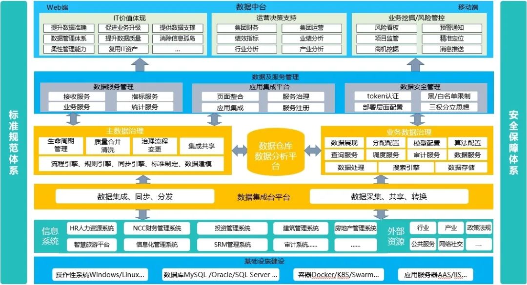 数据中台是基于DAP、MDM和ESB三款核心产品组成的解决方案,主要实现基于数据治理分析的中台建设,通过MDM将企业内部的基础数据标准化、规范化、整合化后,由DAP进行数仓建设以及最终的数据分析和可视化展现,ESB通过数据集成完成整个数据中台的主数据同步分发和数仓数据的抽取汇聚。领导层通过构建数据中台能够快速把控现场实施进度,通过现场数据反馈进度、反馈情况,快速获取第一手资料并协调相关人员工作。根据工程建筑的行业情况进行分析,再根据工程建筑行业的存在价值进行梳理,包括对行业的核心业务,行业发展、特点、信息化建设情况等。工程建筑行业是一个围绕建筑的设计、施工、装修、管理而展开的行业,包括建筑业本身及与之相关的装潢、装修等等。其产品是各种工厂、矿井、铁路、桥梁、港口、道路、管线、住宅以及公共设施的建筑物、构筑物和设施。工程建筑业的产品转给使用者后,就形成了各种生产性和非生产性的固定资产。它是国民经济各物质生产部门和交通运输部门进行生产的手段,是人民生活的重要物质基础。工程建筑行业的核心业务主要围绕建筑设计、施工、装修、管理等一系列土木工程活动。1.适用于管理能力较强的发包方,分别发包,各个供应商之间无隶属以及管理关系的平行发包模式;2.工程总承包单位受发包方委托,由总承包方对工程的质量、安全、造价全面负责的工程总承包模式;3.由项目出资人委托有相应资质的项目代建人对项目的可行性研究、勘察、设计、监理、施工等全过程进行管理的工程代建模式;4.政府和社会资本合作模式,这种又称为‘PPP’模式,即政府和社会资本合作,是公共基础设施中的一种项目运作模式。在这种模式下鼓励民营资本、私营资本与政府共同合作。1.生产流动性:一般工程建筑行业会根据工程建筑的实施地点成立相应的项目办,根据不同的实施地点转移生产点等;2.生产单件性:不同工程建筑的结构、构造等都各不相同,所需的工种、技术原材料等等也各不相同,最后施工方式、机械设备、生产要素也各不相同;3.生产周期较长:较大的工程有可能会持续若干年,所需的人员和工种也较多,材料设备繁杂,交叉作业的工程量也很大;4.露天和高空作业比较多,工程建筑行业受自然气候影响大,采取技术措施多,安全生产要求高等。目前工程建筑行业的信息系统逐渐走向信息化、智能化。工程建筑施工项目管理手段不断升级,渐渐出现数字化、信息化、智能化的应用发展趋势。但是也有很多建筑行业缺少相应的信息化管控,依旧处于落后的管控模式,针对施工现场的管理信息不及时,质量安全问题无法通过,相应分析内容快速暴露甚至规避。针对行业业务存在的问题和痛点进行分析,具有针对性的进总结归纳,包括不同工程建筑行业项目办中领导的观念意识、在项目实施过程中的实施规范、风险管控,以及最终项目决策方面的痛点分析。上面提到过不同工程项目根据坐落位置,会创建不同的项目办,那么在观念意识方面,在一些情况下项目办中的管理领导层并都是从集团公司中派遣,部分情况下会在相关地点招聘本地的相关人员作为领导,并且由于不同项目办的领导人各不相同,他们的思想和理念,针对项目中的管控意识、管控重点、个人习惯都各不相同,难以做到统一把控。在主观意识影响下,部分项目办领导依旧是通过纸质或线下方式进行数据的实时采集,人为进行数据整合,对于信息化建设不重视,导致部分工程建筑行业的相关领导,在信息化建设完毕后,对信息化的使用产生抗拒,不会用、不想用的想法。 在规范管理方面,不同项目办的管理规范各不相同,一个集团公司下的不同管理项目办难以做到统一的实施规范,而管控如果无法做到统一,那么就会产生数据难以收集、数据信息格式各不相同,项目进度、项目投资集团无法掌控第一手资料,数据上报的过程中方式各不相同,无法做到规范化的管理。由于缺少规范化管理,项目安全性难以得到保障,无法做到对项目风险及时管控,在项目实施过程中会出现安全隐患与安全问题,但是在这个过程中缺少相应的问题记录,导致其他项目在实施过程中无法同归有效信息去进行风险排查和安全问题规避。所以在项目实施也是需要相应的信息系统将各个项目办的质量安全类问题进行分析汇总,并为后续其他项目进行借鉴和参考,在不同项目的不同实施阶段针对容易出现的风险隐患进行报警和警示。在运营决策方面,部分工程建筑行业缺少相关信息系统进行数据采集,领导层获取信息数据不及时、分析数据较难,缺少一个统一高效、资源整合、互联互通、信息共享、便捷查询、实时监管的内外一体化数据决策分析平台。领导层在运营决策时,无法获取第一手数据,针对行业的发展和未来趋势分析无法做到一个统一、高效的整体规划,无法支撑企业的运营决策。那么针对上文介绍的工程建筑行业痛点,需要为企业信息化建设的整体进行规划,包括企业的建设目标,整体的体系架构、信息化的建设内容以及企业的数据价值分析。随着企业发展以及信息化建设,在初步搭建企业整体IT框架后,业务系统所产生的数据也在逐渐增多,尤其是不同项目办中风险安全的经验,通过各个项目办不同探索以及经验的总结,系统填报挖掘数据价值。对于工程建筑行业来说,