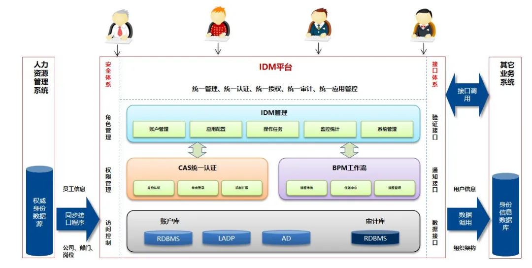 IDM平台内置丰富的对接接口,包含数据初始化,日常维护的增、改、删、查及日志管控,同时平台预置对接认证过程中的统一认证协议接口,满足面向不同协议、架构的系统进行统一认证的管控及管理,本篇文档将主要介绍IDM接口的功能。IDM身份管理平台满足对企业信息系统的统一用户管理、统一身份认证、统一授权管理以及安全审计的要求,能够实现各业务系统的统一登录和集中访问,实现用户身份和权限的统一认证与授权管理,为企业不同的业务系统提供统一的用户管理和认证服务。IDM主要对组织、角色、人员进行管理,并对其所有的状态进行记录,如:初始化、审批中、已启用、已禁用等。账户统一管理可以实现从HR系统中获取组织用户数据,也可直接在IDM系统中录入数据,用户信息中的部分属性信息根据同步策略由HR系统或其它指定系统同步更新到用户目录,其它用户信息可在应用系统中各自进行维护,通过IDM统一用户信息后,发送到各个业务系统。