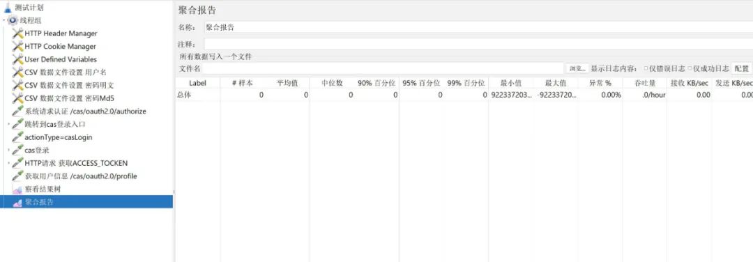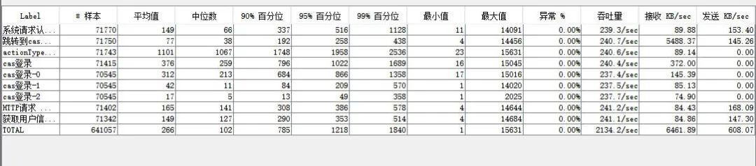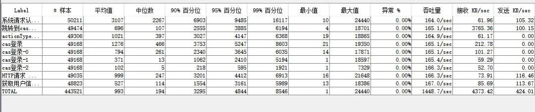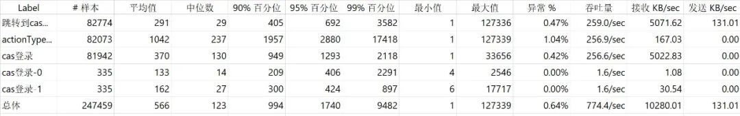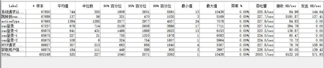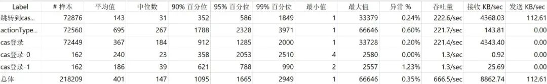 1.CAS认证500并发,5分钟,JMeter聚合报告:异常率正常,平均值正常,吞吐量666.5,详情如下: