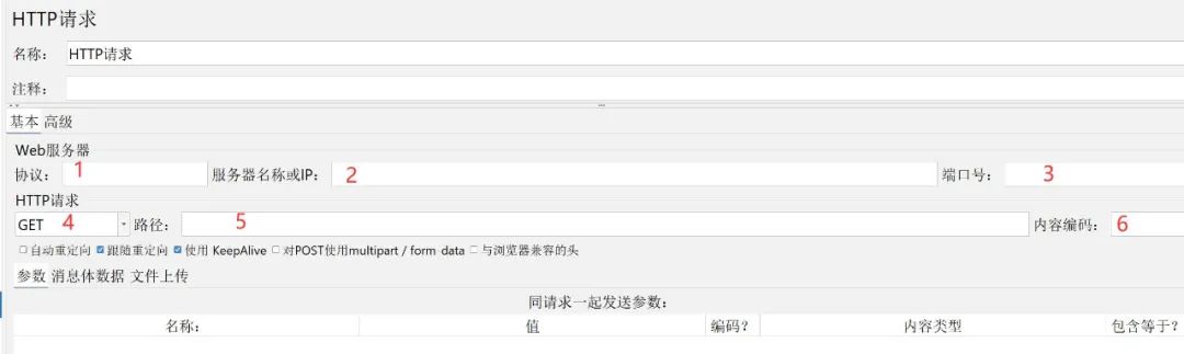 8.右键[线程组]-[取样器]-[HTTP请求](填写CAS登录地址:这里我们需要添加passWord、empCode、service三个参数其中passWord和empCode是从数据文件中提取出来的)。