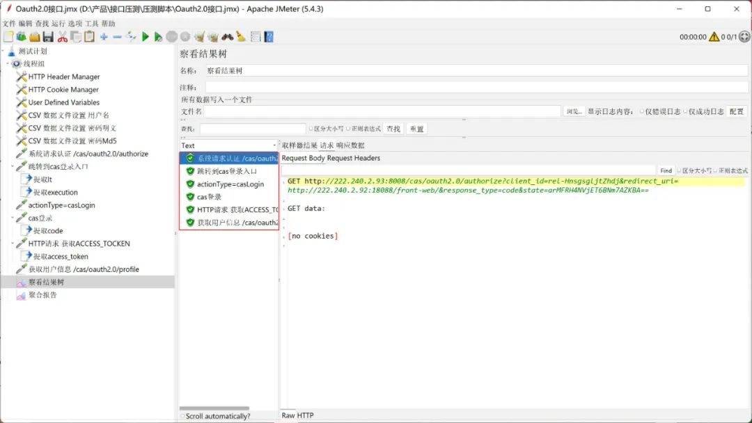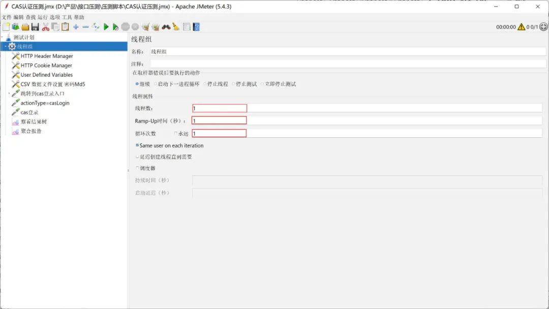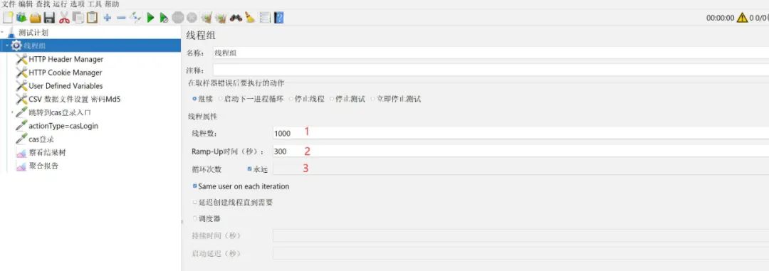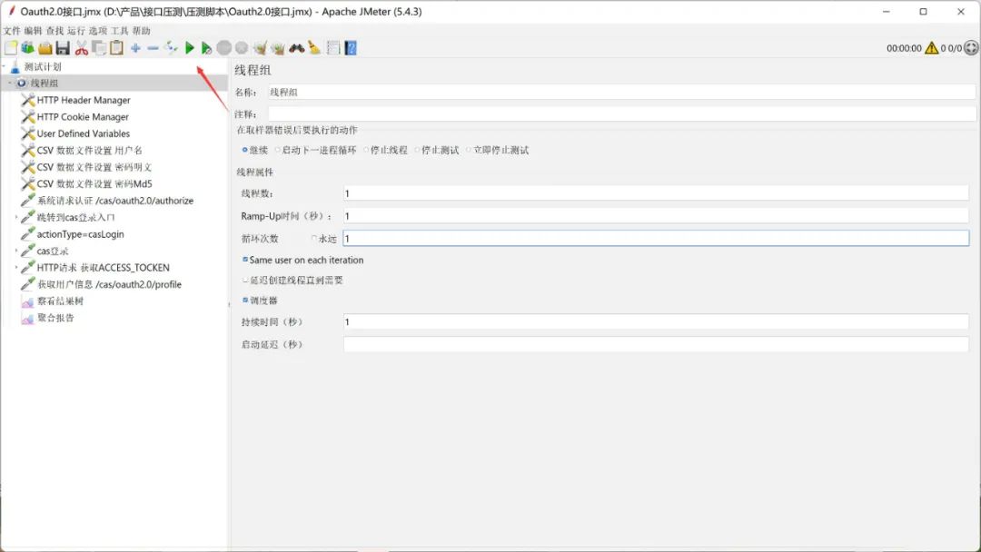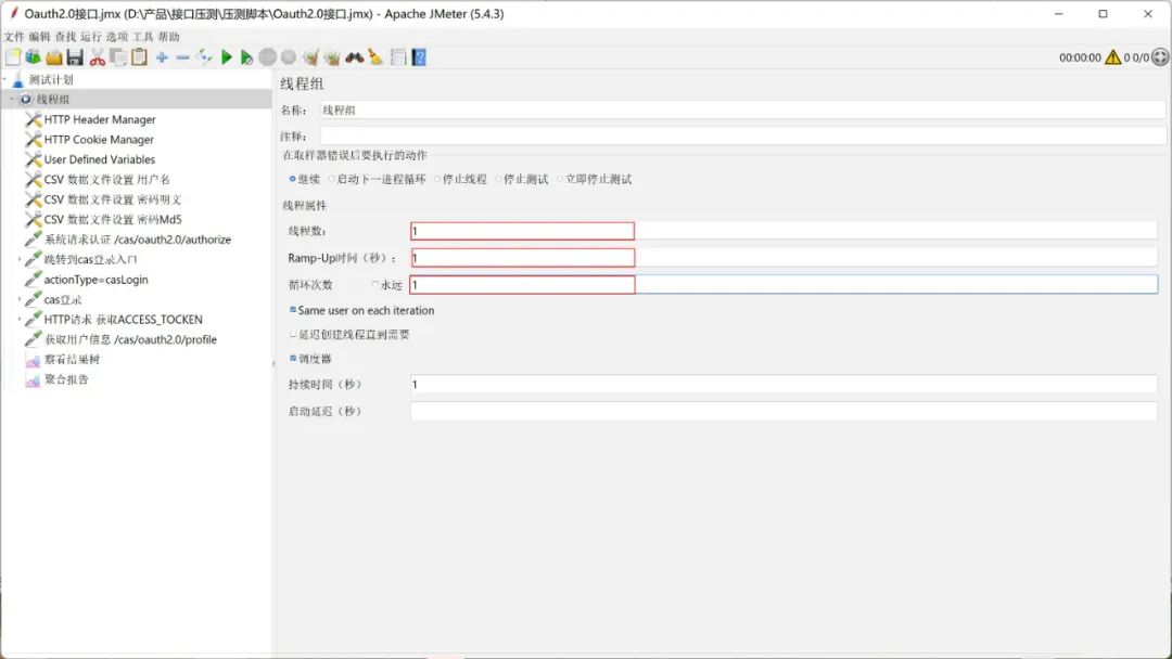 Oauth2.0接口是IDM集团认证所用的接口,如果业务系统在进场时不需要子公司、分公司进行访问,那么他们可以进行这个接口的认证对接。所以在对接之前需要明确业务系统是通过哪种方式来与我们对接的。1.用户在访问业务系统登录时发起认证请求,通过URL跳转的方式请求IDM身份管理平台认证界面,传入client_id、redirect_uri、response_type、state,IDM根据参数返回code及state;注意:state为状态位参数,请求系统在传递调用页面跳转时将state存储缓存中,后续调用请求是先判断state是否在缓存中已经存在,如果存在则为有效请求。2.系统发起请求传入参数client_id、client_secret、redirect_uri、grant_type及code(页面返回的code),IDM身份管理平台进行认证,返回access_token。3.系统根据获取的access_token触发IDM身份管理平台认证,IDM认证成功后返回用户信息Profile,返回至用户登录成功。首先我们需要把线程数和循环次数以及Ramp-Up时间设置为1如下所示: