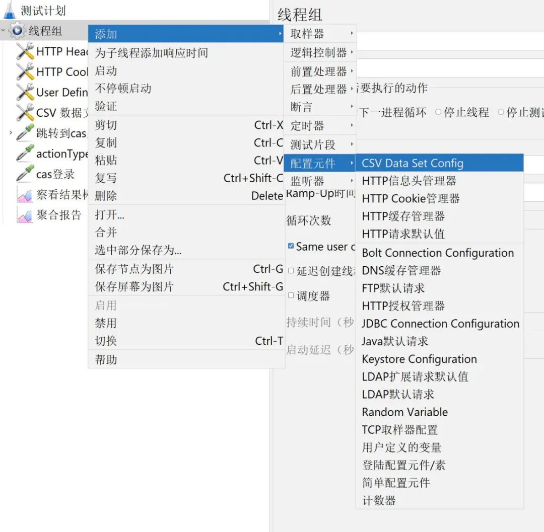 5.右键[线程组]-[配置元件]-[CSV Data Set Config](添加数据文件配置)。