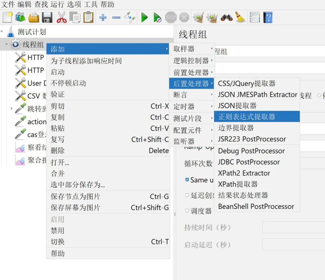 7.右键[HTTP请求]-[后置处理器]-[正则表达式提取器](这里添加两个正则提取器:提取lt和execution后面登录要用到)。