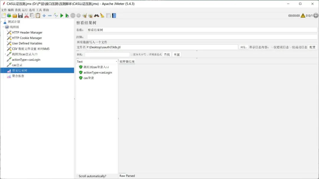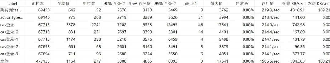 4.CAS认证2000内网并发,5分钟,JMeter聚合报告:异常率正常,平均值正常,吞吐量1506.5,详情如下: