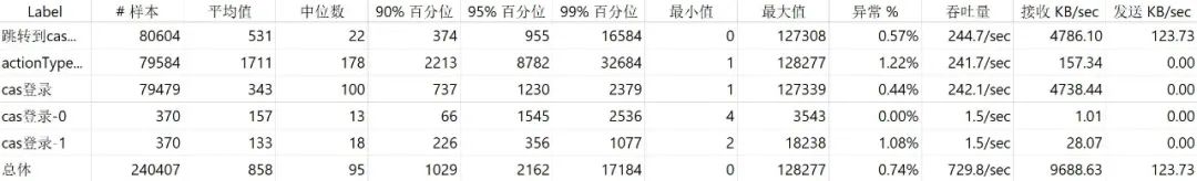 3.CAS认证外网1500并发,5分钟,JMeter聚合报告:异常率正常,平均值正常,吞吐量729.8,详情如下: