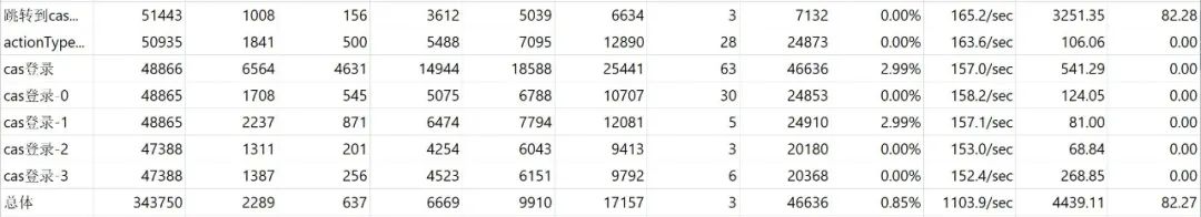 5.CAS认证3000内网并发,5分钟,JMeter聚合报告:异常率正常,平均值正常,吞吐量1103.9,详情如下: