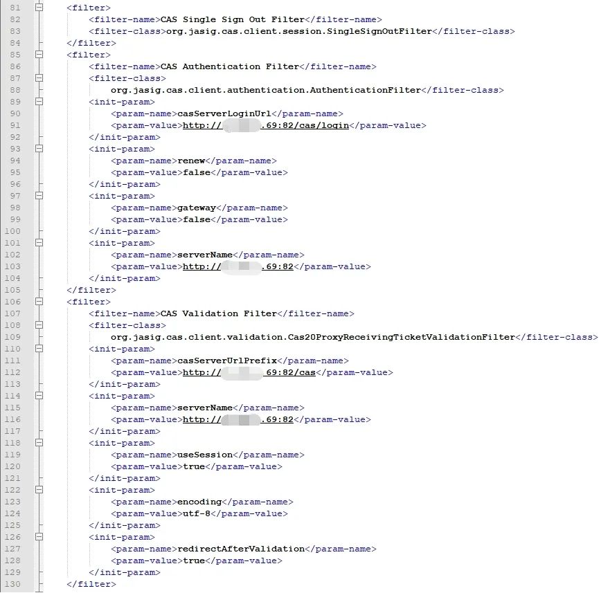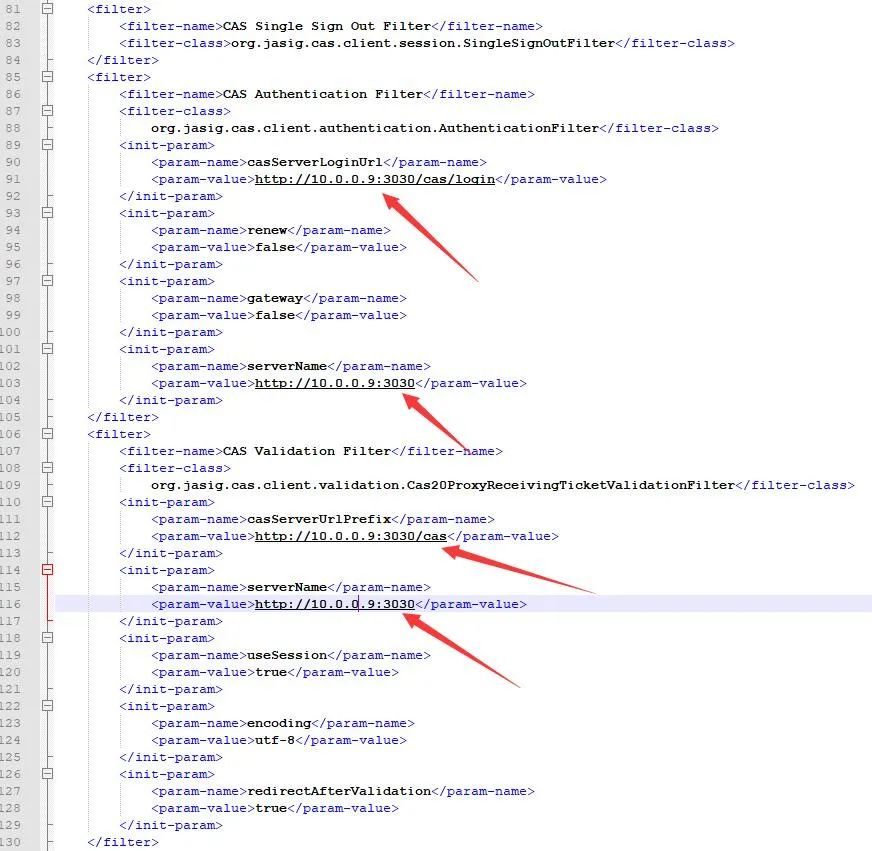 配置CAS认证信息,CAS相关地址配置为内网IP(10.0.0.9:3030/cas),server地址配置为IDM的内网IP(10.0.0.9:3030)。