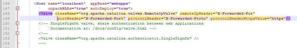 server.xml主要是在Host中添加Value配置,remoteIpHeader、portHeader、protocolHeader、protocolHeaderHttpsValue参数会和Nginx的配置进行关联。