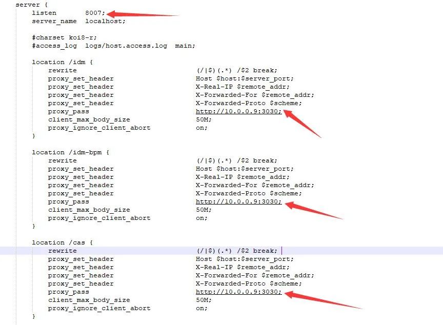 Nginx配置分为内网Nginx配置和外网Nginx配置,内网Nginx主要处理IDM产品的访问,模拟现场环境的内网Nginx,将产品的3030端口代理成8007端口;外网Nginx用于验证外部的访问,将内网Nginx代理到外网,并代理成8008端口。